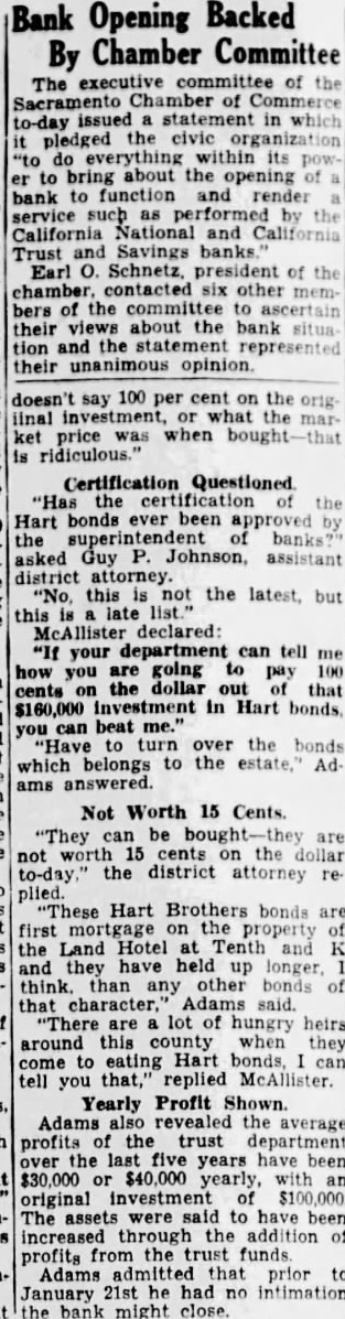 Not Worth 15 Cents. "They be are not worth 15 cents the dollar to-day district attorney replied. "These Hart Brothers bonds first mortgage on the property the Land Hotel at Tenth and and they have held up think. than any other bonds that character, Adams said. "There are lot of hungry heirs around this county when they come to eating Hart bonds, can tell you that," replied McAllister. Yearly Profit Shown. Adams revealed the average profits of the trust department over the last five years have been $30,000 or $40,000 yearly, with original investment of The assets were said to have been increased through the addition of profits from the trust funds Adams that prior to January 21st he had no intimation the bank might close.