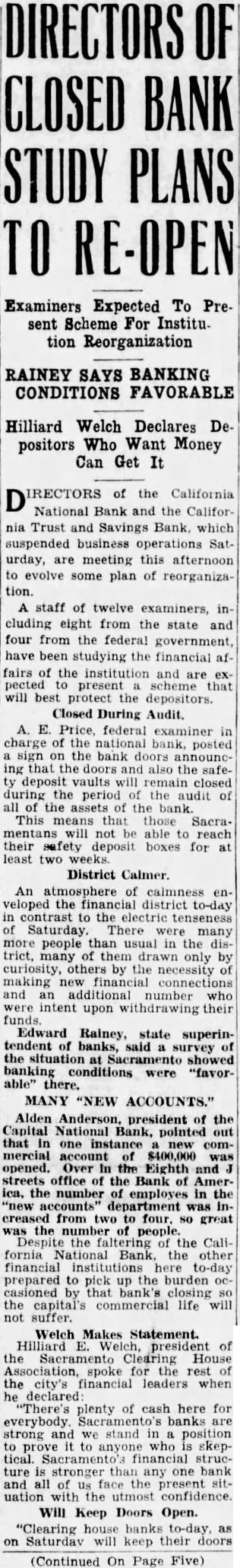 Hilliard Welch Declares Depositors Who Want Money Can Get It of the California National Bank the California Trust and Savings Bank, which suspended business operations Saturday, are meeting this afternoon to evolve some plan of reorganization. staff of twelve examiners, in cluding eight from the state and four from federal government, have been studying financial affairs the institution and are pected scheme will best protect the depositors. Closed During Audit. E. Price, federal examiner in charge the national bank, posted sign the bank doors announcing the deposit vaults will during the period the audit of the This that Sacramentans will not reach their safety deposit boxes for at District Calmer. An atmosphere calmness veloped the financial district to-day contrast to the electric tenseness Saturday. There were many people than usual in the district, many only by curiosity, by the necessity making connections and an additional number who were intent upon withdrawing their Edward Rainey, state superintendent banks, said survey of Sacramento showed banking were "favorable" MANY 'NEW ACCOUNTS." Alden Anderson, president the Capital Bank, pointed out that one commercial account $400,000 opened. Over the Eighth and streets office the Bank of America, the number of employes in the "new department was Infrom two four, great the the California Bank the other financial institutions here to-day prepared to pick up the burden casioned that bank's closing the capital's commercial life not suffer.