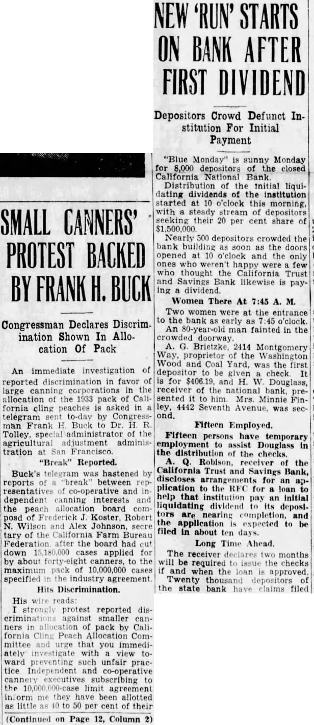 "Blue Monday" sunny Monday for 8,000 depositors of the closed California National Distribution of Initial liquidating of the institution started at 10 o'clock this morning, with steady stream of depositors seeking their 20 per cent share of $1,500,000 Nearly 500 depositors crowded the bank building as soon as the doors opened and the only who happy who thought the California Trust and Savings Bank likewise paying Women There At 7:45 Two women were at the entrance the bank early An fainted in the doorway 2414 Montgomery Way, proprietor the Washington Wood Coal Yard, was the first An immediate investigation of check reported in favor for and Douglass, large receiver the bank the 1933 pack Cali- sented him Mrs. Minnie fornia cling peaches asked in 4442 Seventh Avenue, was telegram sent to-day by Congress- ond. man Frank Buck Dr. Fifteen Employed. Tolley special administrator of the Fifteen persons have temporary agricultural adjustment adminisassist Douglass in tration San Francisco. the distribution the checks. "Break" Reported. Robison, receiver of the telegram hastened California Trust and Savings Bank, Buck's was by discloses for reports of between plication the RFC for loan resentatives of co-operative help that institution pay initial dependent canning interests and liquidating dividend deposithe peach board comtors completion, Koster, Robert application expected to Alex Johnson, secre filed in about ten days. the California Farm Bureau Federation the board had Long Time down 15,180,000 cases applied for The receiver declares months by about canners, the will be the required issue checks maximum pack 10,000,000 cases and the when loan approved specified industry agreement Twenty thousand Hits Discrimination. the state bank claims filed