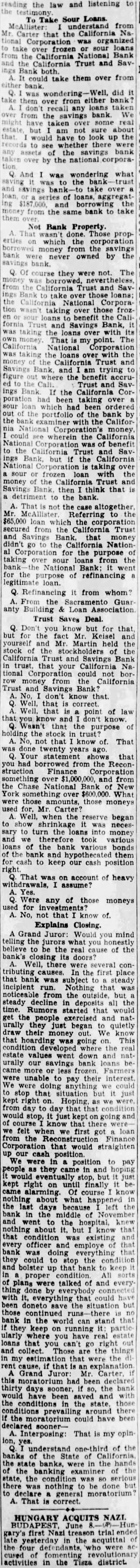 Not Bank Property. That done. propwhich the corporation money from savings never owned by the they were The borrowed, and Sav National taking over those loans benefit Savings Bank, was the with That my point. The National Corporation loans over with the money California Trust and Bank and am trying the benefit accruTrust and ings the California Corhad been taking which had been ordered the portfolio of the bank by the bank with the California Corporation's see wherein the California Corporation was of benefit to the California Trust and ings but if the California National is taking sour or frozen loan with the money the California Trust and Savings Bank then think that detriment to the bank. That not the case altogether Mr. Referring to $65,000 loan which the corporation secured from the California Trust and money didn't go the California National for the purpose taking sour loans from the bank the National for the purpose of refinancing legitimate loan. Q. Refinancing it from whom? From Sacramento Guar anty Building Loan Association Trust Saves Deal. Q. Don't know that but for the fact Mr. Keisel and yourself and Mr. Martin held the stock of the stockholders of the California Trust and Savings Bank in trust, that your California Na tional Corporation could from the California Trust Savings Bank don't know Well, that Well, that point of law you know and don't know. Wasn't that the purpose holding the stock in not that know of. That done twenty years Your statement that you had borrowed from the Reconstruction Finance Corporation and from the Chase National Bank New York something $600,000. What those amounts, those moneys for, Mr Carter? Well, when the reserve began to show shrinkage was necessary to turn the into money we therefore took various loans of the bank various bonds the bank and hypothecated them cash to keep our cash position That on account of heavy assume? Yes. Were any of those moneys used for No, not that know of. Explains Closing. Grand Juror: Would you mind telling the jurors what you honestly believe to be the real cause of the bank's closing its doors? Well, there were several contributing causes. the first place bank subject steady incipient Nothing that noticeable the outside but steady decline deposits all the time. Rumors started that would get the people exercised and naturally they just began to quietly draw their money out. We know that going on. This where the real estate values went down and urally our savings bank loans came more less frozen. Farmers were unable to pay their interest We were doing anything we stop that situation but kept Hoping, as from day that would stop, it just kept going and of that there we felt we first loan from the Reconstruction Finance Corporation that would straighten up our cash position. We were position to pay people as they came in and hoping would eventually but It kept right on until finally came alarming. Of course know nothing about what happened the last days because left the bank in the middle of November and went to the knew nothing about it, but know that that condition existing every officer and employe of bank doing everything they could to stop the condition and bolster that to keep proper All sorts of plans were talked of and thing done by with everything that could doneto the situation but those continued bank the world can stand that they keep on running it: particularly where you have real estate loans that you can't go right out and collect. Those are the things in my estimation that were the rent cause, that an explanation A Grand Juror: Mr. Carter this had been thirty days so, the bank would have saved and the conditions the state, those conditions prevailing around there the could have been declared soonerA. Interposing: That is my opinion, yes. understand one-third of the banks of the State of California the banks, in the hands the banking examiner of the state, the condition was serious there was nothing to be done to declare general moratorium? A. That is correct.