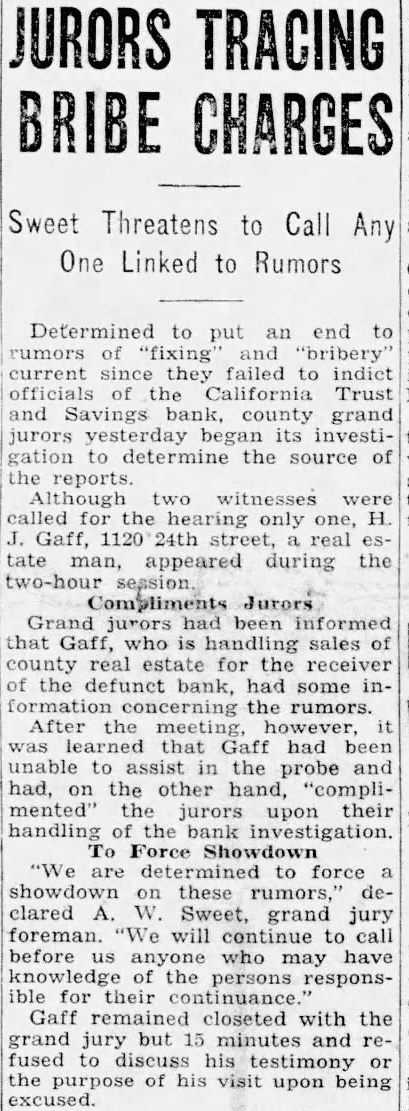 Determined to put an end rumors and "bribery' current since they failed indict officials the California Trust and Savings bank, county grand yesterday its investigation to determine the source reports. Although two witnesses called for the hearing only one, Gaff, 1120 24th street, real tate man, appeared during the two-hour session. Compliments Jurors Grand jurors had been informed that Gaff, who handling sales county real estate for the receiver the defunct bank, had some formation concerning the rumors. After the meeting, however, learned that Gaff had been unable to assist in the probe and had, the other hand, "complimented" the jurors upon their handling of the bank investigation. Force determined force showdown these rumors," declared Sweet, grand jury foreman. will continue to call before anyone who have may the persons responsible for their Gaff remained closeted with the grand jury but 15 minutes and fused to his testimony the of his visit being upon excused.