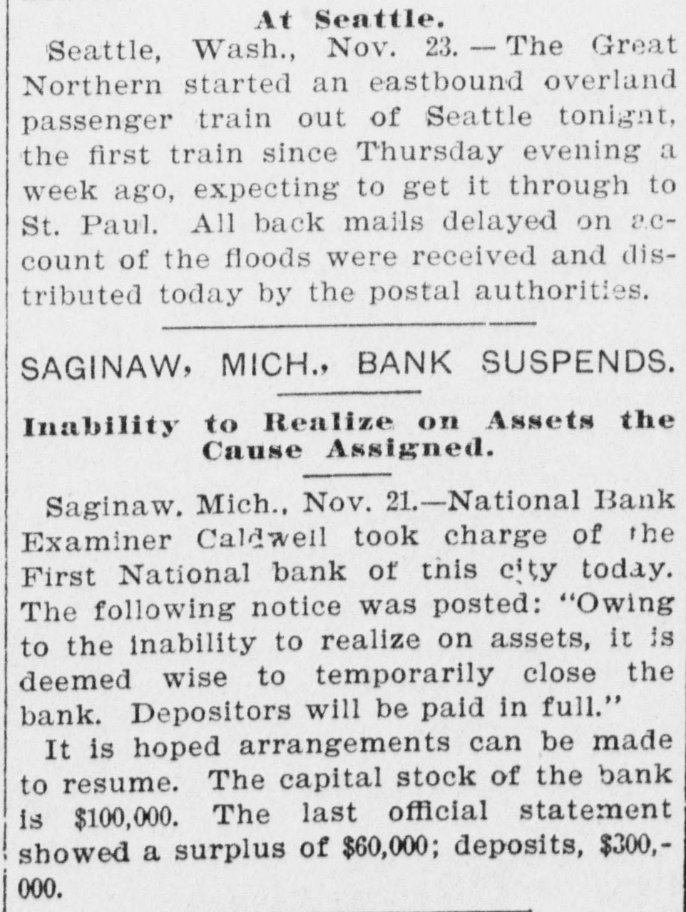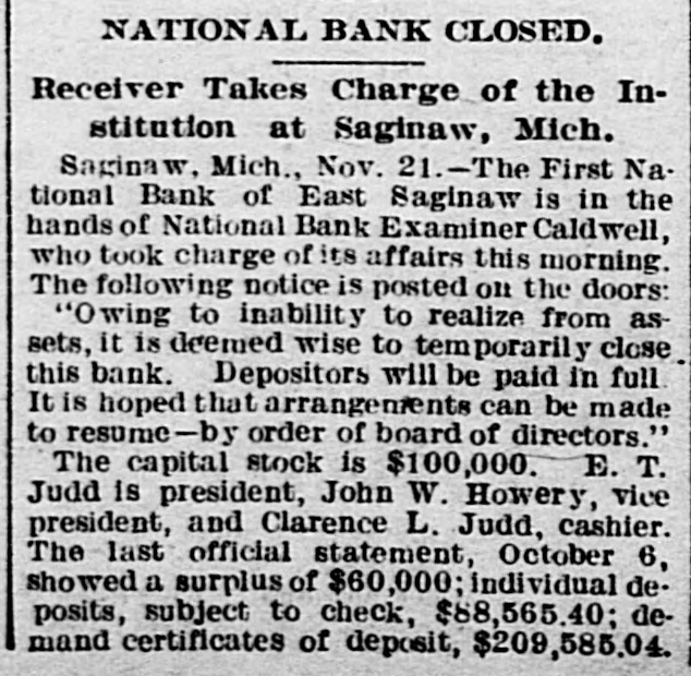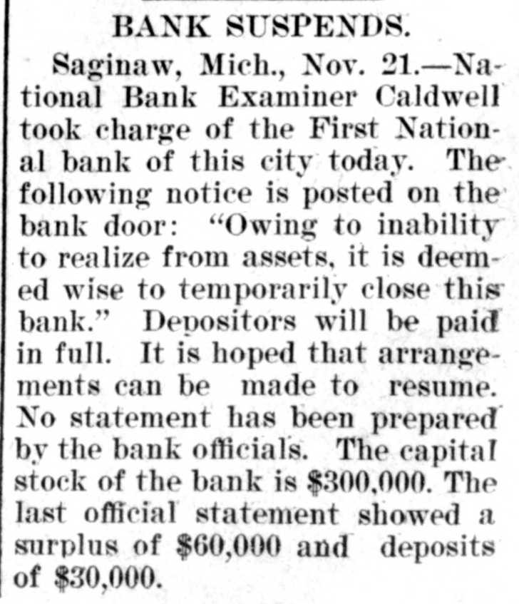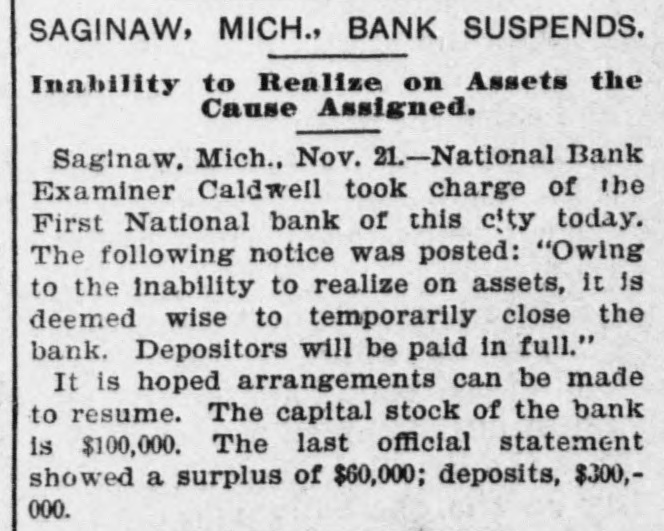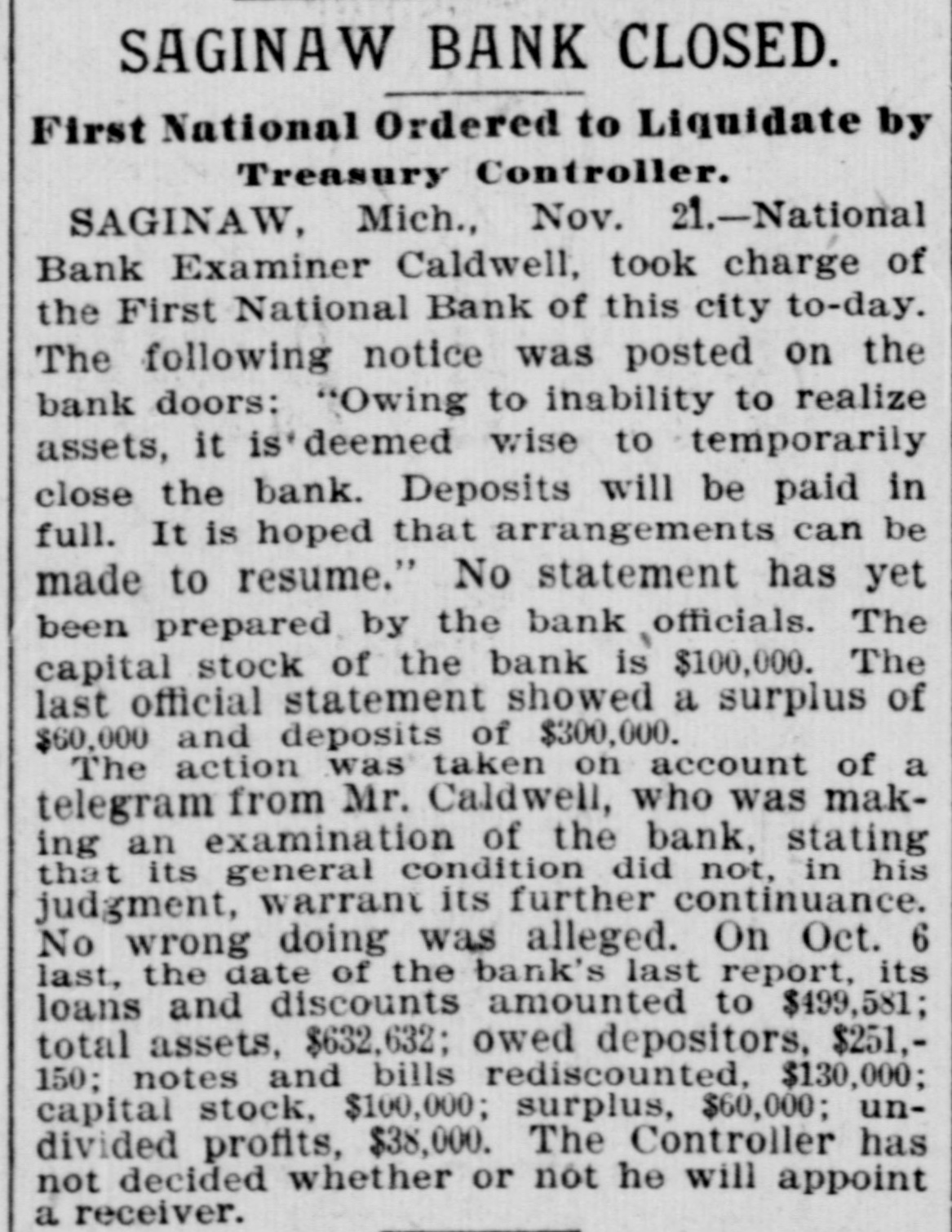 SAGINAW BANK CLOSED. First National Ordered to Liquidate by Treasury Controller. SAGINAW, Mich., Nov. 21.-National Bank Examiner Caldwell, took charge of the First National Bank of this city to-day. The following notice was posted on the bank doors: "Owing to inability to realize assets, it is' 'deemed wise to temporarily close the bank. Deposits will be paid in full. It is hoped that arrangements can be made to resume." No statement has yet been prepared by the bank officials. The capital stock of the bank is $100,000. The last official statement showed a surplus of $60,000 and deposits of $300,000. The action was taken on account of a telegram from Mr. Caldwell, who was making an examination of the bank, stating that its general condition did not, in his judgment, warrant its further continuance. No wrong doing was alleged. On Oct. 6 last, the date of the bank's last report, its loans and discounts amounted to $499,581; total assets, $632,632; owed depositors, $251,150; notes and bills rediscounted, $130,000; capital stock, $100,000; surplus, $60,000; undivided profits, $38,000. The Controller has not decided whether or not he will appoint a receiver.