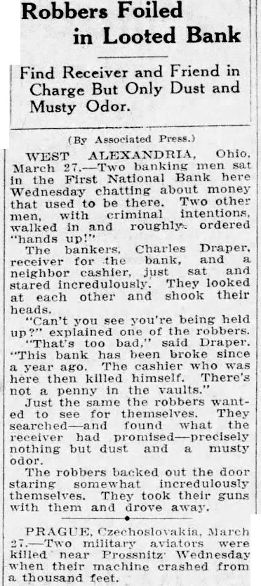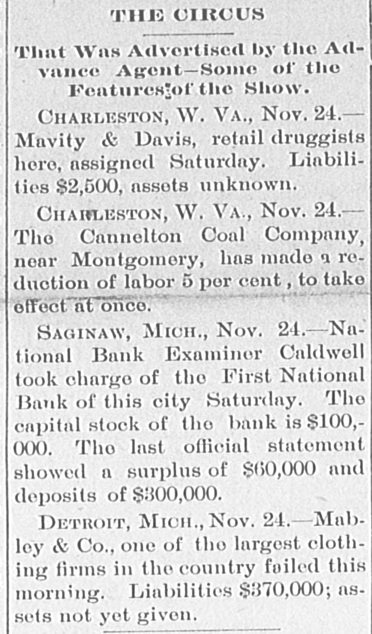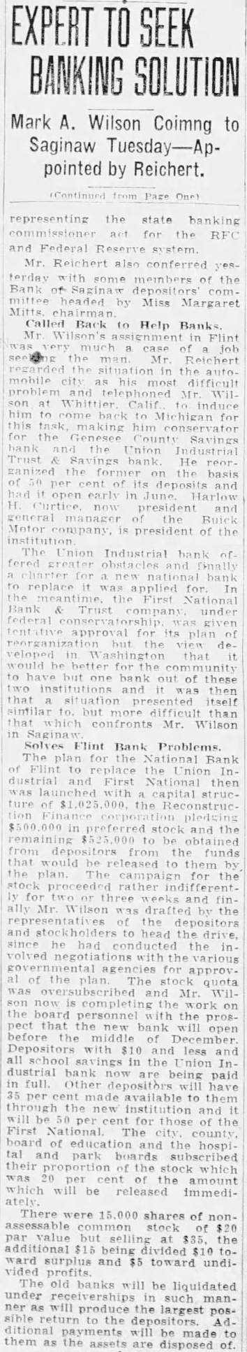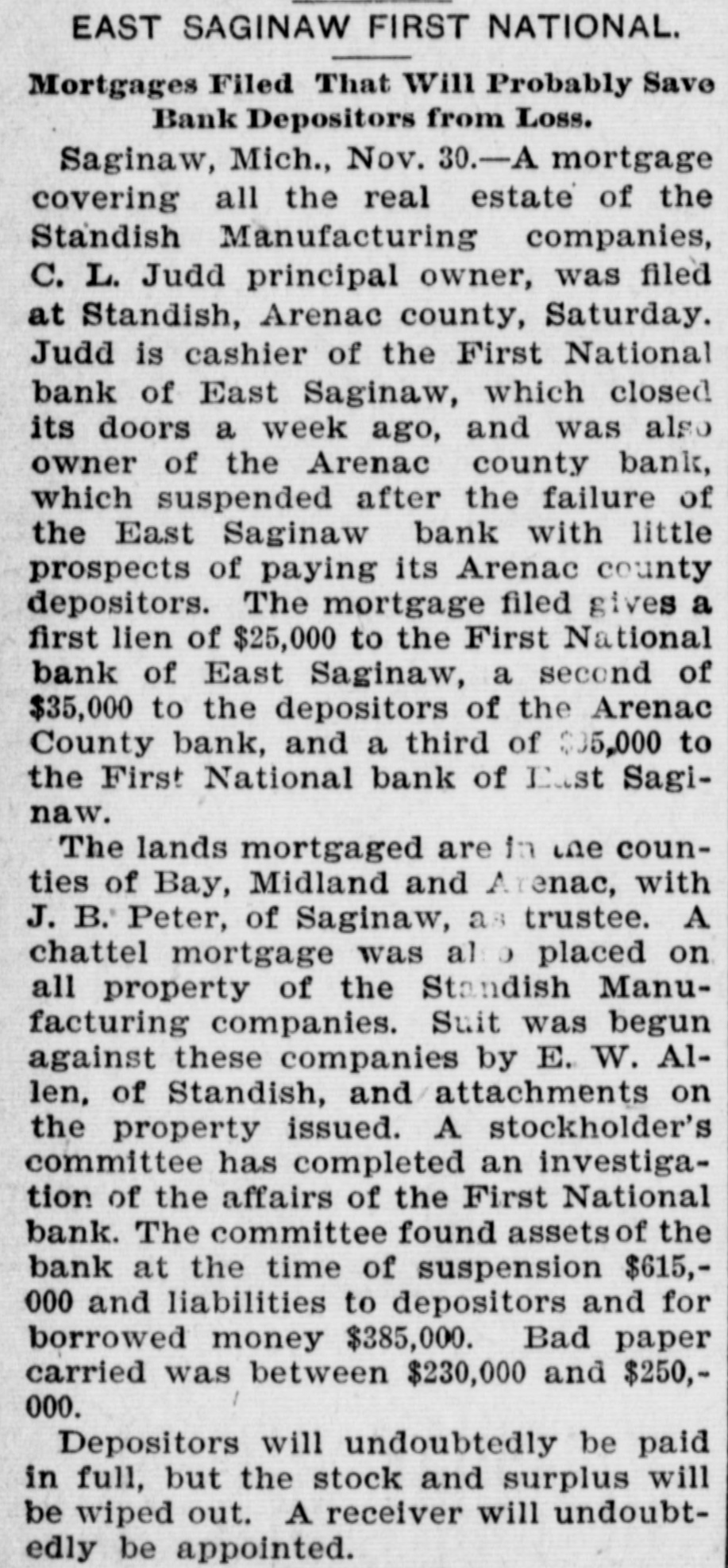SAGINAW BANK CLOSED. First National Ordered to Liquidate by Treasury Controller. SAGINAW, Mich., Nov. 21.-National Bank Examiner Caldwell, took charge of the First National Bank of this city to-day. The following notice was posted on the bank doors: "Owing to inability to realize assets, it is' 'deemed wise to temporarily close the bank. Deposits will be paid in full. It is hoped that arrangements can be made to resume." No statement has yet been prepared by the bank officials. The capital stock of the bank is $100,000. The last official statement showed a surplus of $60,000 and deposits of $300,000. The action was taken on account of a telegram from Mr. Caldwell, who was making an examination of the bank, stating that its general condition did not, in his judgment, warrant its further continuance. No wrong doing was alleged. On Oct. 6 last, the date of the bank's last report, its loans and discounts amounted to $499,581; total assets, $632,632; owed depositors, $251,150; notes and bills rediscounted, $130,000; capital stock, $100,000; surplus, $60,000; undivided profits, $38,000. The Controller has not decided whether or not he will appoint a receiver.