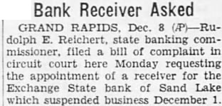 Bank Receiver Asked GRAND RAPIDS. Dec. 8 (/P)-Rudolph E. Reichert, state banking commissioner. filed a bill of complaint in circuit court here Monday requesting the appointment of a receiver for the Exchange State bank of Sand Lake which suspended business December 1.
