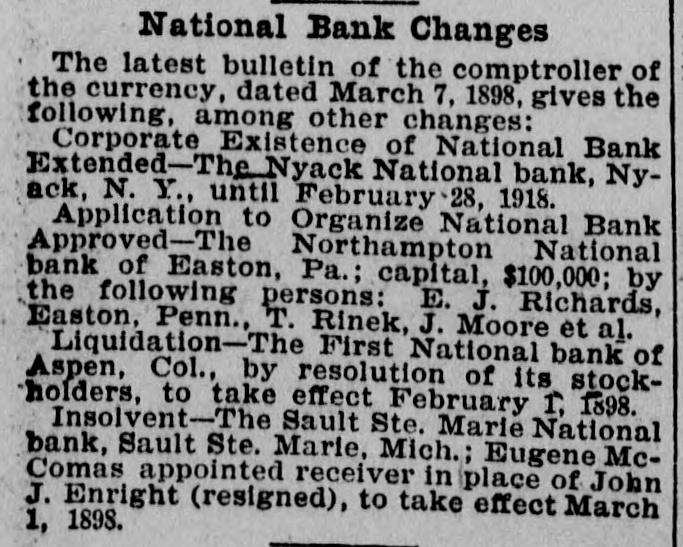 National Bank Changes The latest bulletin of the comptroller of the currency, dated December 13, 1897, gives the following among other changes: National banks organized-The Franklin National Bank, Franklin, Ohio (capital $50,000), N. J. Catrow, president; Ralph B. Parks, cashier. The National Bank of Seneca, Kansas (capital $50,000), Jacob E. Taylor, president; John A. Gilchrist, cashier. Corporate existence of national bank extended-The Exchange National Bank of Olean, New York, until December 6, 1917. Application to organize national bank pproved-The Citizens' National Bank of Coshocton, Ohio, with a capital of $50,000, by the following persons: John M. Compton, Jerry A. Compton, John J. Rose and others. Liquidation-The First National Bank of Ovid, Michigan, has gone into voluntary liquidation by resolution of its stockholders dated October 13, 1897. to take effect December 1, 1897. Insolvent-The Sault Ste. Marie National Bank, Sault Ste. Marie, Michigan, was on December 10, 1897, placed in the hands of John J. Enright, receiver.