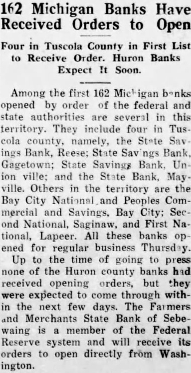 162 Michigan Banks Have Received Orders to Open Four in Tuscola County in First List to Receive Order. Huron Banks Expect It Soon. Among the first 162 banks opened by order of the federal and state are several in this territory. They include four in Tuscola county, namely, the State ings Bank, Reese: State Sav Bank, Gagetown; State Savings Bank. Union ville: and the State Bank, Mayville. Others the territory are the Bay City National Peoples Commercial Savings, Bay City; Second National, Saginaw, and First National, Lapeer. All these banks opened for regular business Thursday. Up to the time of going to press none of the Huron county banks had received opening orders, but they expected to come through withthe next few days. The Farmers and Merchants State Bank of Sebewaing is member of the Federal Reserve system and will receive its orders to open directly from Washington.
