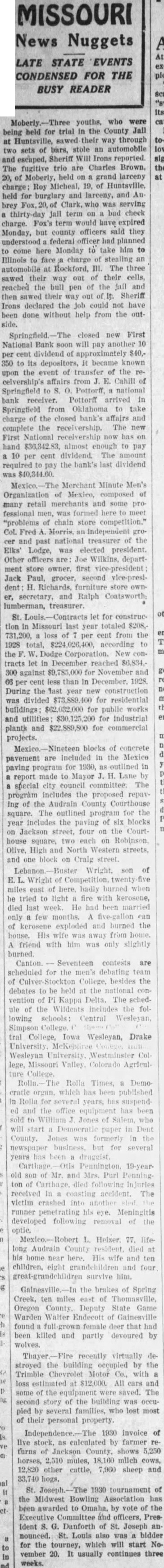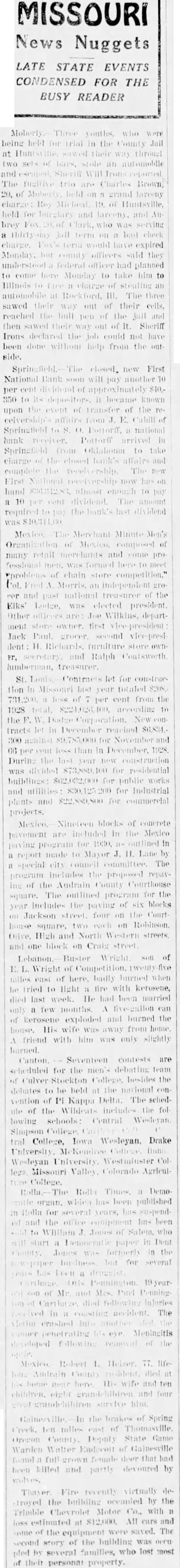 LATE STATE EVENTS CONDENSED FOR THE BUSY READER youths, who were being held for trial the County Jall at Huntsville, sawed their way through two sets of bars, stole an automobile and escaped, Sheriff WIH Irons reported. The fugitive trio are Charles Brown, 20, of Moberly, held on grand larceny charge; Roy Micheal, 19, of Huntsville, held for burglary and lareeny, and Aubrey Clark, was serving thirty-day Jail term on bad check charge. Fox's term would have expired Monday, but county officers said they understood federal had planned to come here Monday to take him to Illinois to face charge of stealing an automobile Rockford, III. The three sawed their way out of their cells, reached the bull pen of the Jall and then sawed their way out Sheriff Irons declared the job could not have been done without help from the outside. Springfield.-The closed new First National Bank will pay another 10 per cent dividend of approximately $40.350 to Its depositors, became known upon the event of transfer of the receivership's affairs from E. Cahill of Springfield to Pottorff, national bank receiver. Pottorff arrived in Springfield from Oklahoma to take charge of the closed bank's affairs and the receivership. The new First National receivership now has on hand $36,342.83, almost enough to pay 10 per cent dividend. The amount required to pay the bank's last dividend was Merchant Minute Men's Organization of Mexico, composed of many retail merchants and some professional men, was formed here to meet "problems of chain store competition." Col. Fred Morris grocer and past national treasurer of the Elks' Lodge, was elected president. Other officers are: Joe Wilkins, department store owner, first vice-president Jack Paul, grocer, second vice-prestdent: H. Richards, furniture store owner, secretary, and Ralph Contsworth lumberman, treasurer. St. let for construetion in Missouri last year totaled $208, 731,200, per cent from the 1928 total, $224,026,400, according to the W. Dodge Corporation. New contracts let in December $6,834.300 against $9,785,000 for November and 66 cent less than In December. 1928. During the last year new construction was divided $73,889,400 for residential buildings: $62,032,000 for public works and utilities: for Industrial plants and $22,889,800 for commercial projects. blocks of concrete pavement are included in the Mexico paving program for 1930, in report made to Mayor H. Lane by special city council committee. The program includes the proposed repaying of the Audrain County Courthouse square. The outlined program for the year includes the paving of six blocks on Jackson street, four on the Courthouse square, two each on Robinson Olive, High and North Western streets, and one block on Cralg street. Lebanon. Buster Wright. son of L. Wright of Competition, miles east of here. badly burned when he tried to light fire with kerosene, died last week. He had been married only few months. five-gallon can of kerosene exploded and burned the house. His wife away from home. friend with him was only slightly burned. Canton. Seventeen contests are scheduled for the men's debating team of College, besides the debates to be held the national convention of Kappa Delta. The schedule of the Wildeats includes the following schools: Central Wesleyan, Simpson tral College, Iowa Wesleyan, Drake University McKebliree Wesleyan University Westminster College, Missouri Valley Colorado Agriculture The Rolla Times, Democratic organ, which has been published In Rolla for several years, has suspendand the office equipment has been sold to William Jones of Salem, who will start Democratic puper in Dent County. was formerly the but for several years has been druggist. Carthage 19-yearold son of Mr. and Mrs. Purl Penning ton of Carthage. died following Injuries received In coasting accident. The victim crashed into another runner penetrating his eye. Meningitis developed following removal of the long Audrain County resident. died at his home near here. His wife and ten children, eight and four survive him. the brakes of Spring Creek, ten miles east of Thomasville, Oregon County, Deputy State Game Warden Walter Endecott of found female deer that had been killed and partly devoured by wolves. recently virtually destroyed the building by the Trimble Chevrolet Motor Co., with loss estimated at $12,000. All cars and some of the were saved. The second story of the building was occupied by several families, who lost most of their personal property. 1930 Invoice of Ilve stock, as calculated by farmer returns of County, shows 5,250 horses, 2,510 mules, 18,160 mllch cows, 12,820 other cattle, 7,960 sheep and St. 1930 tournament of the Midwest Bowling Association has been awarded Omaha. by vote of the Executive Committee and officers, President S. G. Danforth of St. Joseph announced. St. Louis also was a bidder for the tourney, which will start No. vember 20. It usually continues three weeks.