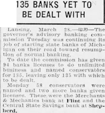 135 BANKS YET TO BE DEALT WITH March banking commission Tuesday continuing its banks of Michtheir toward resumption commission has given 94 banks licenses do unlimited business and conservators for only 135 with which dealt Monday 58 conservators were named and given the Mechanics bank Flint and Central State Savings bank at Shepherd.