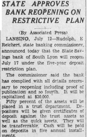 STATE APPROVES BANK ON RESTRICTIVE PLAN (By Associated Press) LANSING, July 12-Rudolph, Reichert. state banking commissioner, announced today that the State Savings bank of South Lyon will reopen July 17 under the five-year deposit restriction plan. The commissioner said the bank has complied with all details neccessary to reopening including proof publication and fourth. It will capitalized at Fifty percent of the assets will placed trust department. Depositors will certificates deposit against trust assets the quick assets. They will be transferrable Cash will deposits in five annual installments.