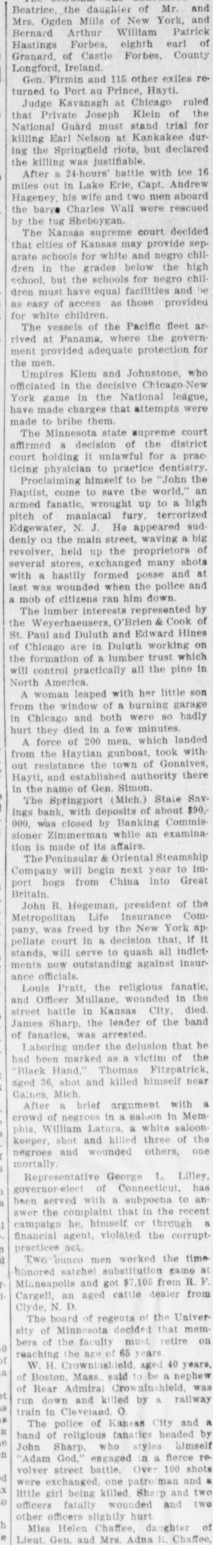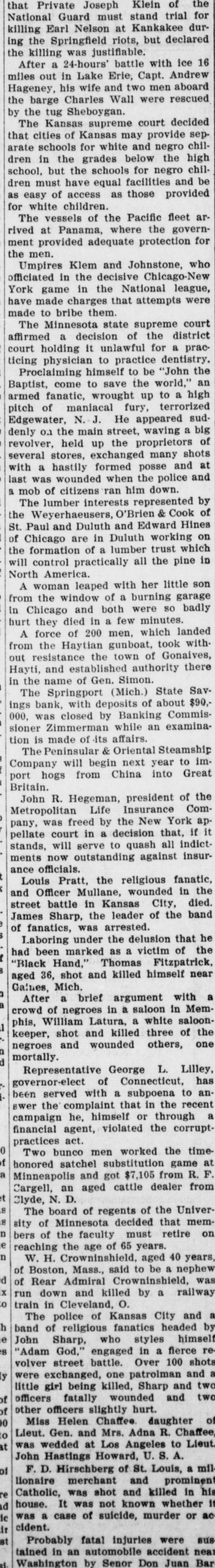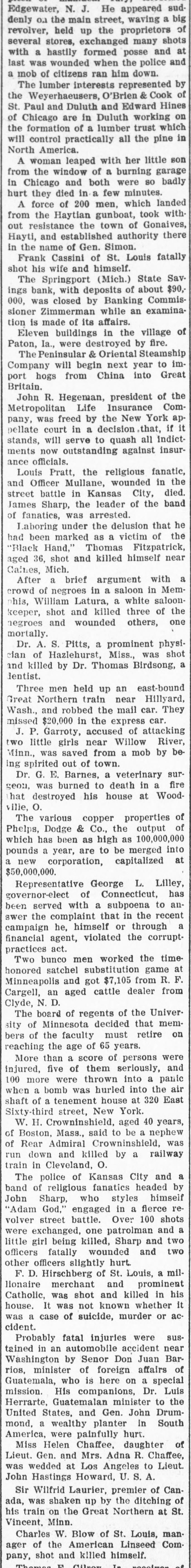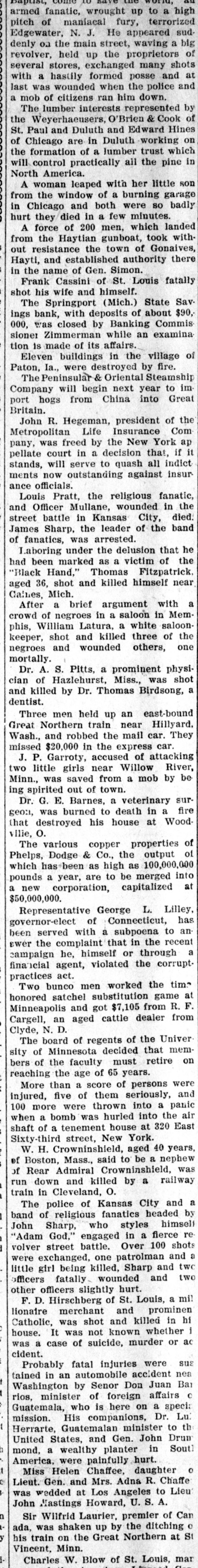 Edgewater, N. J. He appeared suddenly on the main street, waving a big revolver, held up the proprietors of several stores, exchanged many shots with a hastily formed posse and at last was wounded when the police and a mob of citizens ran him down. The lumber interests represented by the Weyerhaeusers, O'Brien & Cook of St. Paul and Duluth and Edward Hines of Chicago are in Duluth working on the formation of a lumber trust which will control practically all the pine in North America. A woman leaped with her little son from the window of a burning garage in Chicago and both were so badly hurt they died in a few minutes. A force of 200 men, which landed from the Haytian gunboat, took with out resistance the town of Gonaives, Hayti, and established authority there in the name of Gen. Simon. Frank Cassini of St. Louis fatally shot his wife and himself. The Springport (Mich.) State Sav. ings bank, with deposits of about $90,000, was closed by Banking Commissioner Zimmerman while an examination is made of its affairs. Eleven buildings in the village of Paton, Ia., were destroyed by fire. The Peninsular & Oriental Steamship Company will begin next year to import hogs from China into Great Britain. John R. Hegeman, president of the Metropolitan Life Insurance Company, was freed by the New York appellate court in a decision that, if it stands, will serve to quash all Indictments now outstanding against insuroffetate. acco Louis Pratt, the religious fanatic, and Officer Mullane, wounded in the street battle in Kansas City, died. James Sharp, the leader of the band of fanatics, was arrested. Laboring under the delusion that he had been marked as a victim of the "Black Hand," Thomas Fitzpatrick, aged 36, shot and killed himself near Caines, Mich. After a brief argument with a crowd of negroes in a saloon in Memphis, William Latura, a white saloonkeeper, shot and killed three of the negroes and wounded others, one mortally. Dr. A. S. Pitts, a prominent physician of Hazlehurst, Miss., was shot and killed by Dr. Thomas Birdsong, a dentist. Three men held up an east-bound Great Northern train near Hillyard, Wash., and robbed the mail car. They missed $20,000 in the express car. J. P. Garroty, accused of attacking two little girls near Willow River, Minn., was saved from a mob by being spirited out of town. Dr. G. E. Barnes, a veterinary surgeon, was burned to death in a fire hat destroyed his house at WoodO 1111 The various copper properties of Phelps, Dodge & Co., the output of which has been as high as 100,000,000 pounds a year, are to be merged into a new corporation, capitalized at $50,000,000. Representative George L. Lilley, governor-elect of Connecticut, has been served with a subpoena to answer the complaint that in the recent campaign he, himself or through a financial agent, violated the corruptpractices act. Two bunco men worked the timehonored satchel substitution game at Minneapolis and got $7,105 from R. F. Cargell, an aged cattle dealer from Clyde, N. D. The board of regents of the University of Minnesota decided that members of the faculty must retire on reaching the age of 65 years. More than a score of persons were injured, five of them seriously, and 100 more were thrown into a panic when a bomb was hurled into the air shaft of a tenement house at 320 East Sixty-third street, New York. W. H. Crowninshield, aged 40 years, of Boston, Mass., said to be a nephew of Rear Admiral Crowninshield, was run down and killed by a railway train in Cleveland, O. The police of Kansas City and a band of religious fanatics headed by John Sharp, who styles himself "Adam God," engaged in a fierce revolver street battle. Over 100 shots were exchanged, one patrolman and a little girl being killed, Sharp and two officers fatally wounded and two other officers slightly hurt. F. D. Hirschberg of St. Louis, a millionaire merchant and prominent Catholic, was shot and killed in his house. It was not known whether it was a case of suicide, murder or accident. Probably fatal injuries were sustained in an automobile accident near