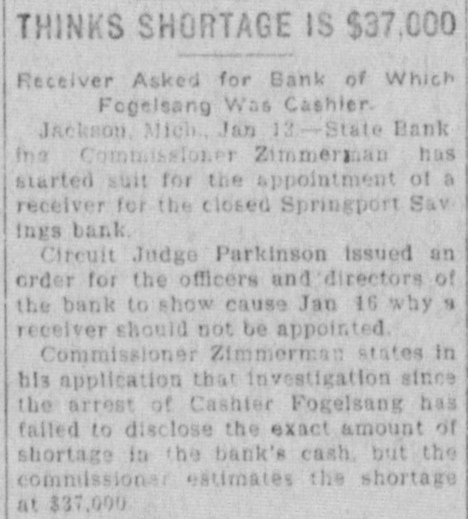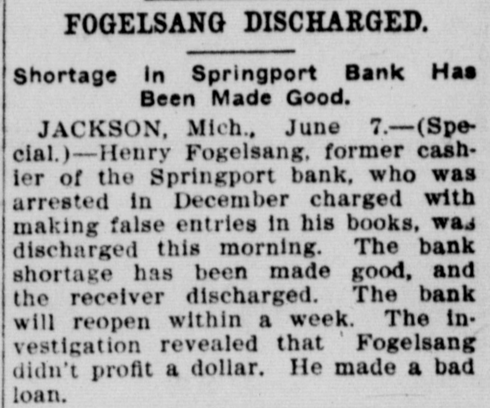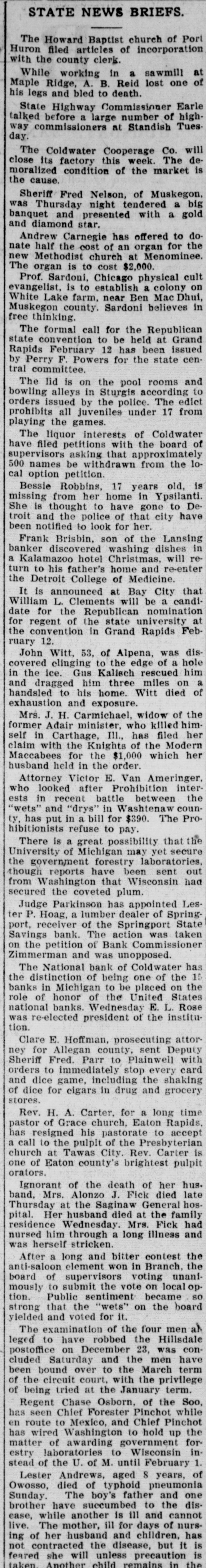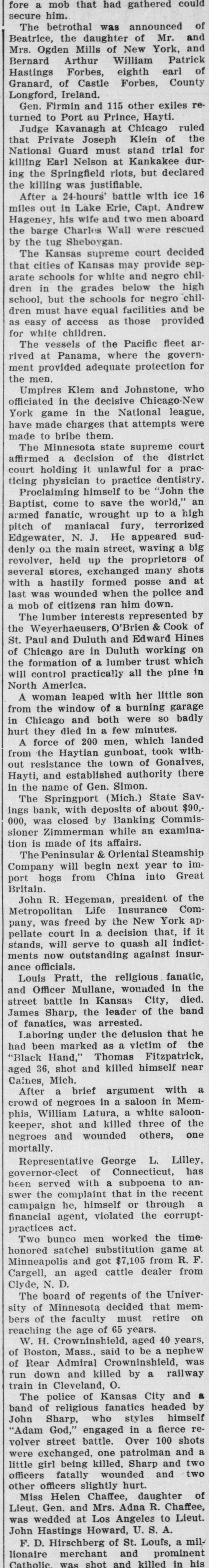 Edgewater, N. J. He appeared suddenly on the main street, waving a big revolver, held up the proprietors of several stores, exchanged many shots with a hastily formed posse and at last was wounded when the police and a mob of citizens ran him down. The lumber interests represented by the Weyerhaeusers, O'Brien & Cook of St. Paul and Duluth and Edward Hines of Chicago are in Duluth working on the formation of a lumber trust which will control practically all the pine in North America. A woman leaped with her little son from the window of a burning garage in Chicago and both were so badly hurt they died in a few minutes. A force of 200 men, which landed from the Haytian gunboat, took with out resistance the town of Gonaives, Hayti, and established authority there in the name of Gen. Simon. Frank Cassini of St. Louis fatally shot his wife and himself. The Springport (Mich.) State Sav. ings bank, with deposits of about $90,000, was closed by Banking Commissioner Zimmerman while an examination is made of its affairs. Eleven buildings in the village of Paton, Ia., were destroyed by fire. The Peninsular & Oriental Steamship Company will begin next year to import hogs from China into Great Britain. John R. Hegeman, president of the Metropolitan Life Insurance Company, was freed by the New York appellate court in a decision that, if it stands, will serve to quash all Indictments now outstanding against insuroffetate. acco Louis Pratt, the religious fanatic, and Officer Mullane, wounded in the street battle in Kansas City, died. James Sharp, the leader of the band of fanatics, was arrested. Laboring under the delusion that he had been marked as a victim of the "Black Hand," Thomas Fitzpatrick, aged 36, shot and killed himself near Caines, Mich. After a brief argument with a crowd of negroes in a saloon in Memphis, William Latura, a white saloonkeeper, shot and killed three of the negroes and wounded others, one mortally. Dr. A. S. Pitts, a prominent physician of Hazlehurst, Miss., was shot and killed by Dr. Thomas Birdsong, a dentist. Three men held up an east-bound Great Northern train near Hillyard, Wash., and robbed the mail car. They missed $20,000 in the express car. J. P. Garroty, accused of attacking two little girls near Willow River, Minn., was saved from a mob by being spirited out of town. Dr. G. E. Barnes, a veterinary surgeon, was burned to death in a fire hat destroyed his house at WoodO 1111 The various copper properties of Phelps, Dodge & Co., the output of which has been as high as 100,000,000 pounds a year, are to be merged into a new corporation, capitalized at $50,000,000. Representative George L. Lilley, governor-elect of Connecticut, has been served with a subpoena to answer the complaint that in the recent campaign he, himself or through a financial agent, violated the corruptpractices act. Two bunco men worked the timehonored satchel substitution game at Minneapolis and got $7,105 from R. F. Cargell, an aged cattle dealer from Clyde, N. D. The board of regents of the University of Minnesota decided that members of the faculty must retire on reaching the age of 65 years. More than a score of persons were injured, five of them seriously, and 100 more were thrown into a panic when a bomb was hurled into the air shaft of a tenement house at 320 East Sixty-third street, New York. W. H. Crowninshield, aged 40 years, of Boston, Mass., said to be a nephew of Rear Admiral Crowninshield, was run down and killed by a railway train in Cleveland, O. The police of Kansas City and a band of religious fanatics headed by John Sharp, who styles himself "Adam God," engaged in a fierce revolver street battle. Over 100 shots were exchanged, one patrolman and a little girl being killed, Sharp and two officers fatally wounded and two other officers slightly hurt. F. D. Hirschberg of St. Louis, a millionaire merchant and prominent Catholic, was shot and killed in his house. It was not known whether it was a case of suicide, murder or accident. Probably fatal injuries were sustained in an automobile accident near