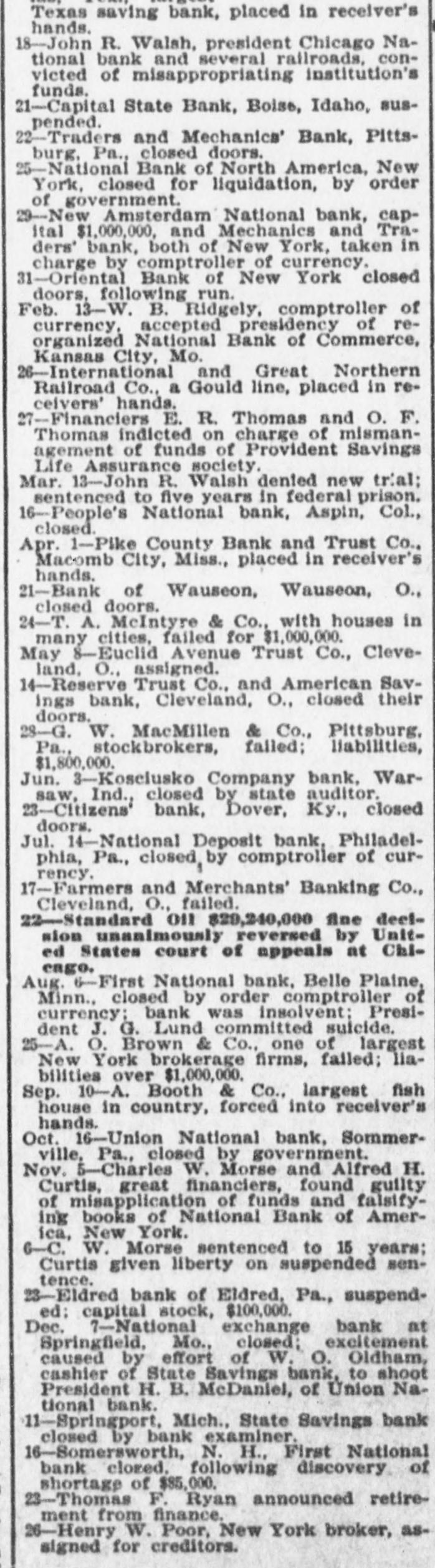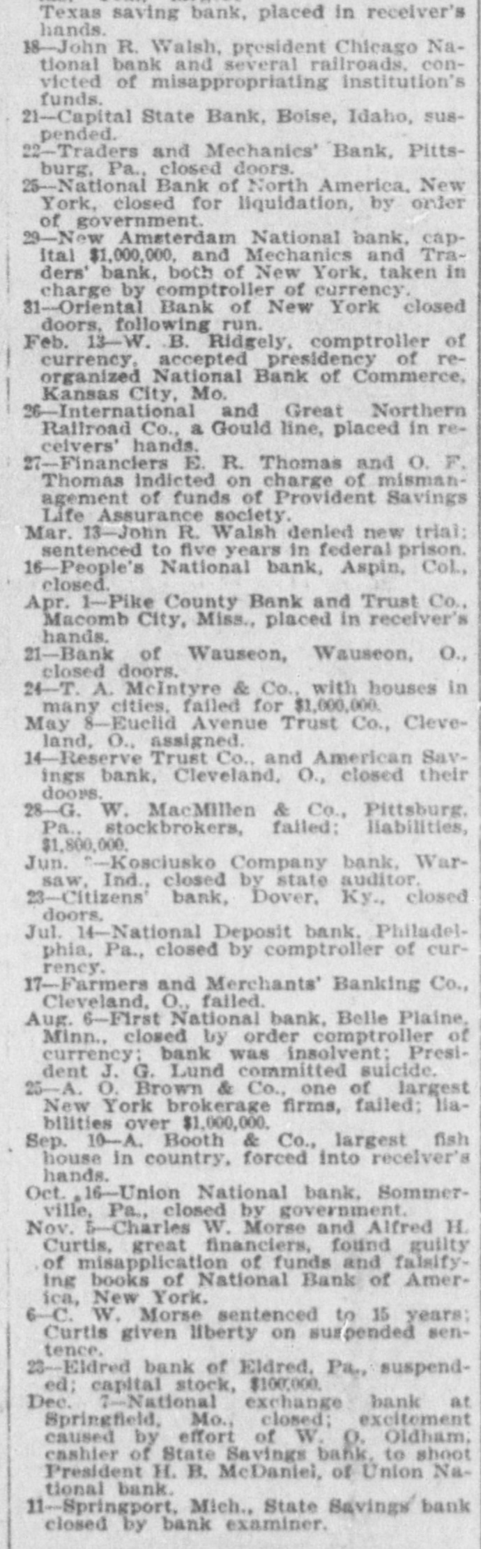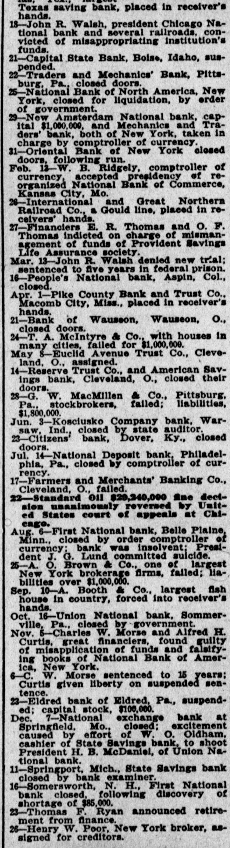 Texas saving bank, placed in receiver's hands. 18-John R. Walsh, president Chicago National bank and several railroads. convicted of misappropriating institution's funds. 21-Capital State Bank, Boise, Idaho, suspended. 22-Traders and Mechanics' Bank, Pittsburg, Pa., closed doors. 25-National Bank of North America, New York, closed for liquidation, by order of government. 29-New Amsterdam National bank, capItal $1,000,000, and Mechanics and Traders' bank, both of New York, taken in charge by comptroller of currency. 31-Oriental Bank of New York closed doors, following run. Feb. 13-W. .B. Ridgely, comptroller of currency. accepted presidency of reorganized National Bank of Commerce, Kansas City, Mo. 26-International and Great Northern Railroad Co., a Gould line, placed in receivers' hands. 27-Financiers E. R. Thomas and O. F. Thomas Indicted on charge of mismanagement of funds of Provident Savings Life Assurance society. Mar. 13-John R. Walsh denied new trial: sentenced to five years in federal prison. 16-People's National bank, Aspin, CoL, closed. Apr. 1-Pike County Bank and Trust Co., Macomb City, Miss., placed in receiver's hands. 21-Bank of Wauseon, Wauseon, O., closed doors. 24-T. A. McIntyre & Co., with houses in many cities, failed for $1,000,000. May 8-Euclid Avenue Trust Co., Cleveland, O., assigned. 14-Reserve Trust Co., and American Savings bank, Cleveland, O., closed their doors. 28-G. W. MacMillen & Co., Pittsburg. Pa., stockbrokers, failed: liabilities, $1,800,000. Jun. "-Kosciusko Company bank, Warsaw, Ind., closed by state auditor. 23-Citizens' bank, Dover, Ky., closed doors, Jul. 14-National Deposit bank. Philadelphia, Pa., closed by comptroller of currency. 17-Farmers and Merchants' Banking Co., Cleveland, O., failed. Aug. 6-First National bank, Belle Plaine, Minn., closed by order comptroller of currency: bank was insolvent: President J. G. Lund committed suicide. 25-A. O. Brown & Co., one of largest New York brokerage firms, failed; liabilities over $1,000,000. Sep. 10-A. Booth & Co., largest fish house in country, forced into receiver's hands. Oct. 16-Union National bank. Sommerville, Pa., closed by government. Nov. 5-Charles W. Morse and Alfred H. Curtis, great financiers, found guilty of misapplication of funds and falsifyIng books of National Bank of America, New York. 6-C. W. Morse sentenced to 15 years: Curtis given liberty on surpended sentence. 23-Eldred bank of Eldred. Pa., suspended; capital stock, $100,000. Dec. 7-National exchange bank at Springfield, Mo., closed; excitement caused by effort of W. 0. Oldham, cashier of State Savings bank. to shoot President H. B. McDaniel, of Union National bank. 11-Springport, Mich., State Savings bank closed by bank examiner.