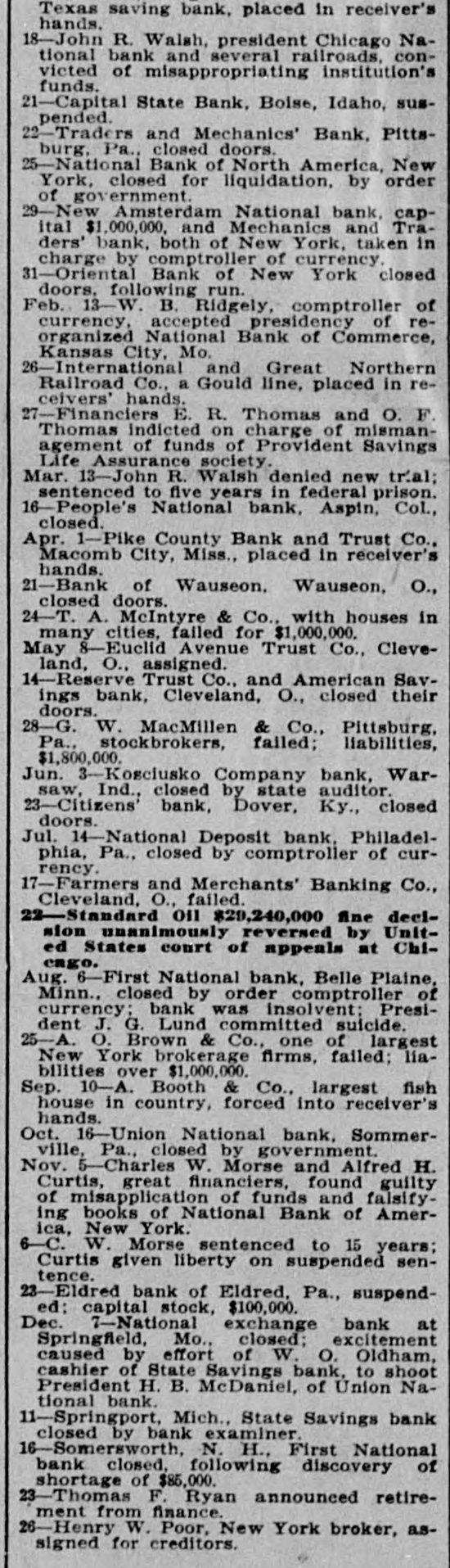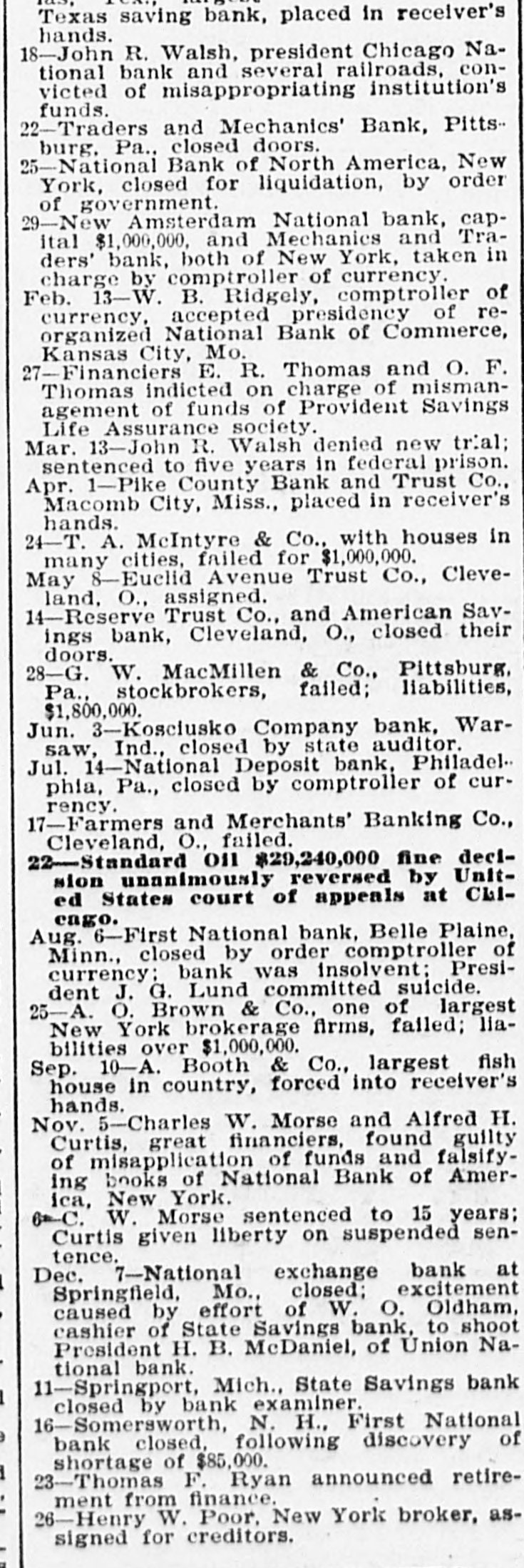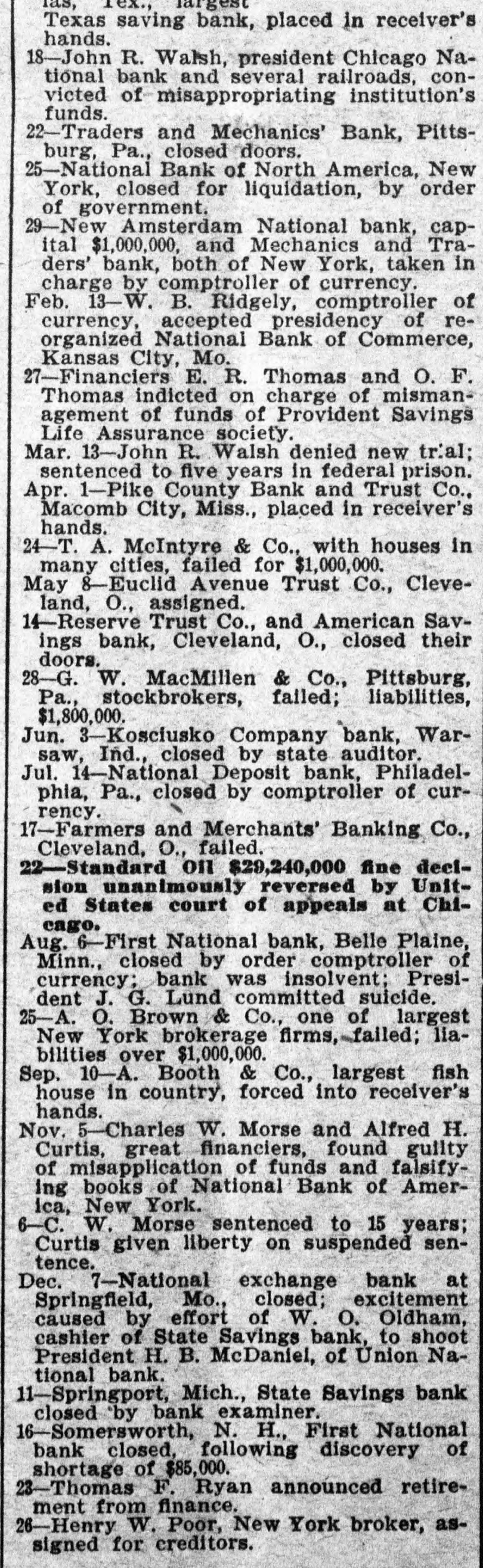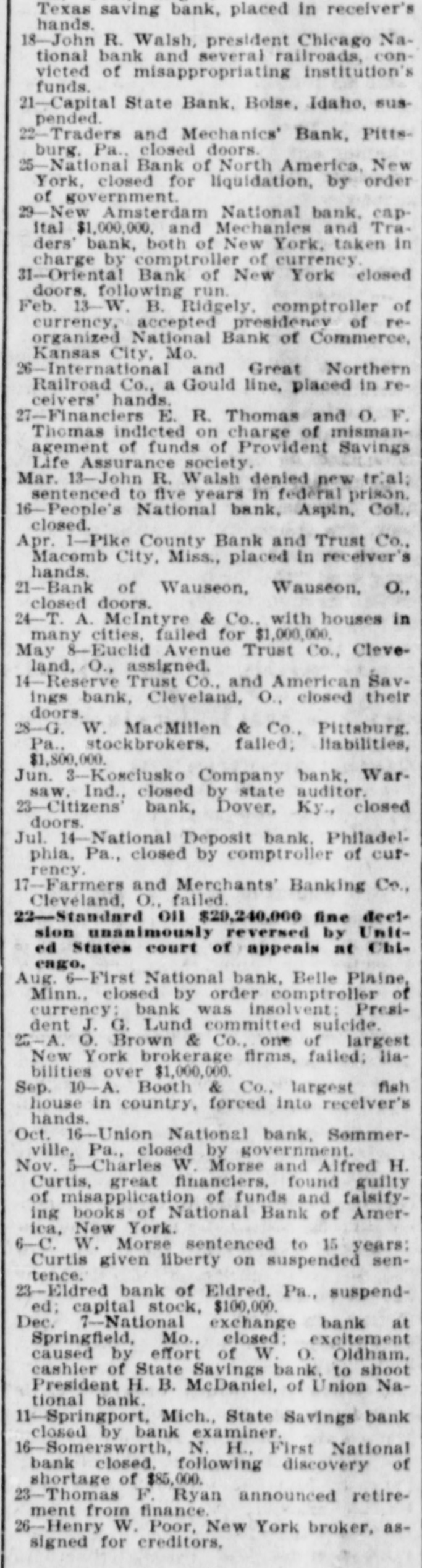 Texas saving bank, placed in receiver's hands. 18-John R. Walsh, president Chicago National bank and several railroads. convicted of misappropriating institution's funds. 21-Capital State Bank, Boise, Idaho, suspended. 22-Traders and Mechanics' Bank, Pittsburg, Pa., closed doors. 25-National Bank of North America, New York, closed for liquidation, by order of government. 29-New Amsterdam National bank, capItal $1,000,000, and Mechanics and Traders' bank, both of New York, taken in charge by comptroller of currency. 31-Oriental Bank of New York closed doors, following run. Feb. 13-W. .B. Ridgely, comptroller of currency. accepted presidency of reorganized National Bank of Commerce, Kansas City, Mo. 26-International and Great Northern Railroad Co., a Gould line, placed in receivers' hands. 27-Financiers E. R. Thomas and O. F. Thomas Indicted on charge of mismanagement of funds of Provident Savings Life Assurance society. Mar. 13-John R. Walsh denied new trial: sentenced to five years in federal prison. 16-People's National bank, Aspin, CoL, closed. Apr. 1-Pike County Bank and Trust Co., Macomb City, Miss., placed in receiver's hands. 21-Bank of Wauseon, Wauseon, O., closed doors. 24-T. A. McIntyre & Co., with houses in many cities, failed for $1,000,000. May 8-Euclid Avenue Trust Co., Cleveland, O., assigned. 14-Reserve Trust Co., and American Savings bank, Cleveland, O., closed their doors. 28-G. W. MacMillen & Co., Pittsburg. Pa., stockbrokers, failed: liabilities, $1,800,000. Jun. "-Kosciusko Company bank, Warsaw, Ind., closed by state auditor. 23-Citizens' bank, Dover, Ky., closed doors, Jul. 14-National Deposit bank. Philadelphia, Pa., closed by comptroller of currency. 17-Farmers and Merchants' Banking Co., Cleveland, O., failed. Aug. 6-First National bank, Belle Plaine, Minn., closed by order comptroller of currency: bank was insolvent: President J. G. Lund committed suicide. 25-A. O. Brown & Co., one of largest New York brokerage firms, failed; liabilities over $1,000,000. Sep. 10-A. Booth & Co., largest fish house in country, forced into receiver's hands. Oct. 16-Union National bank. Sommerville, Pa., closed by government. Nov. 5-Charles W. Morse and Alfred H. Curtis, great financiers, found guilty of misapplication of funds and falsifyIng books of National Bank of America, New York. 6-C. W. Morse sentenced to 15 years: Curtis given liberty on surpended sentence. 23-Eldred bank of Eldred. Pa., suspended; capital stock, $100,000. Dec. 7-National exchange bank at Springfield, Mo., closed; excitement caused by effort of W. 0. Oldham, cashier of State Savings bank. to shoot President H. B. McDaniel, of Union National bank. 11-Springport, Mich., State Savings bank closed by bank examiner.