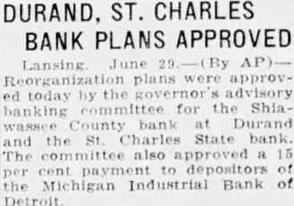 Durand, St. Charles bank plans approved (June 29, 1933). The plans approved ... by the Shia[wassee] County bank Durand and the State ... also approved ... depositors of Industrial Bank of Michigan (article indicates approval of plans for St. Charles bank).