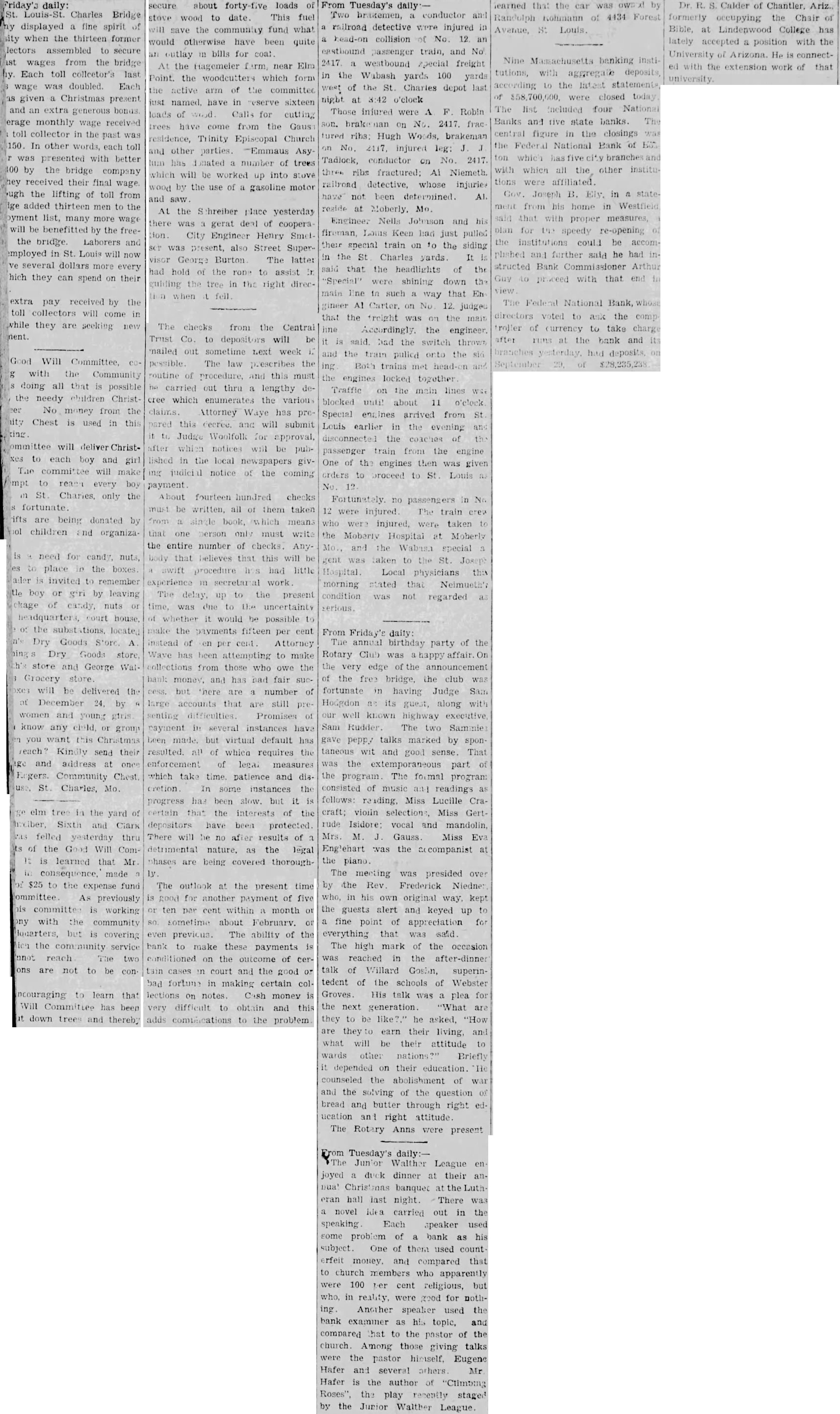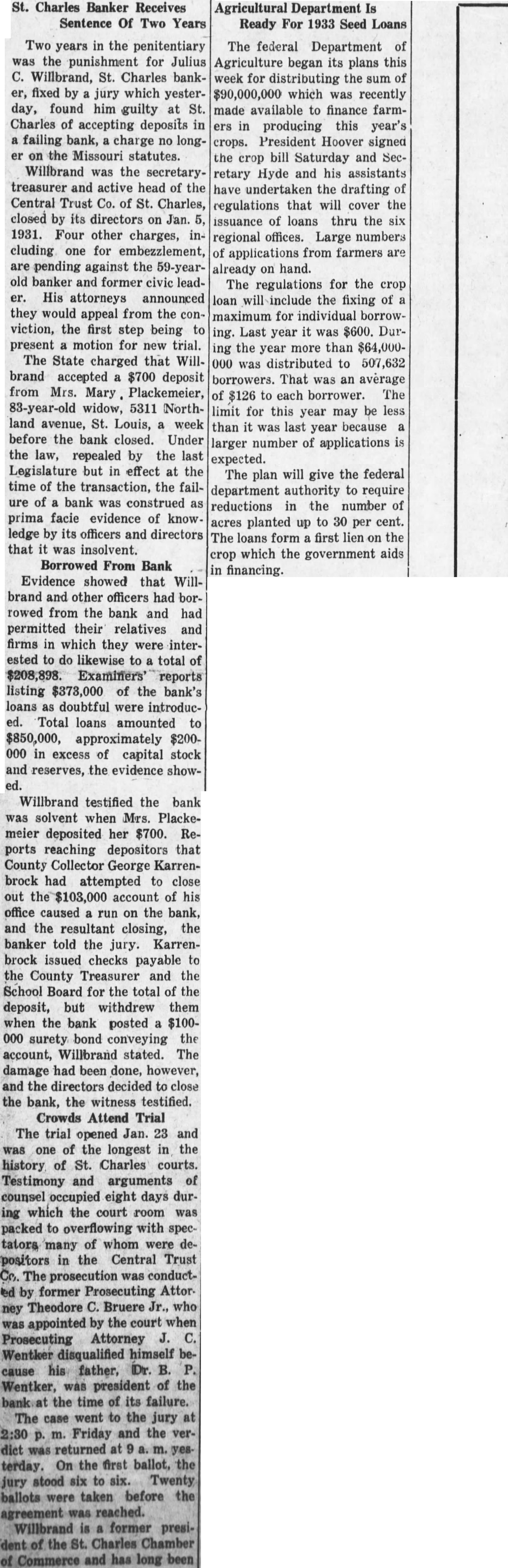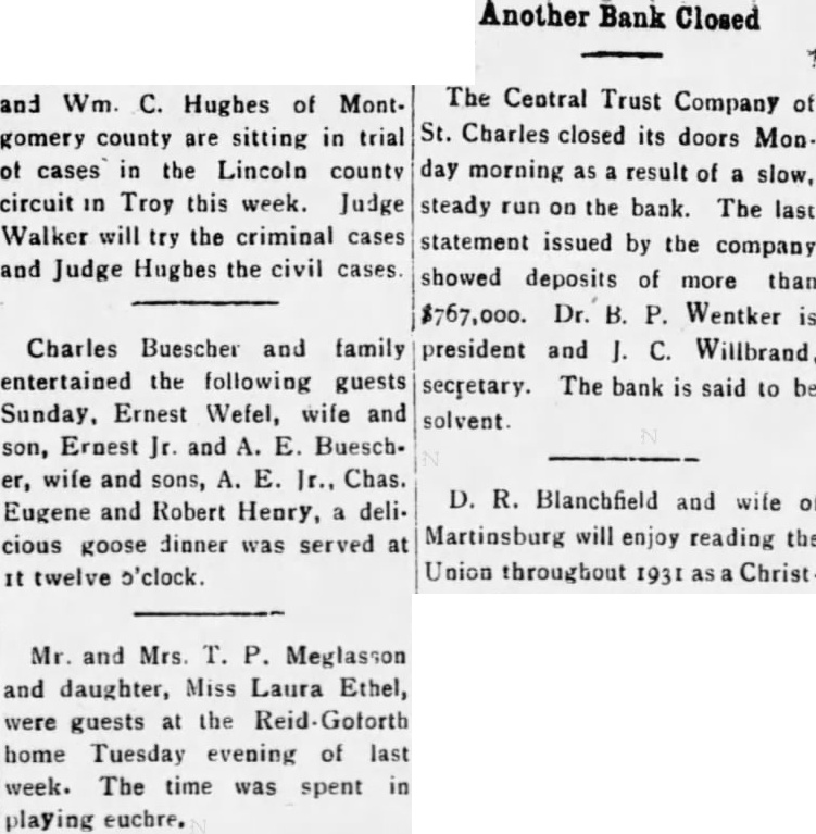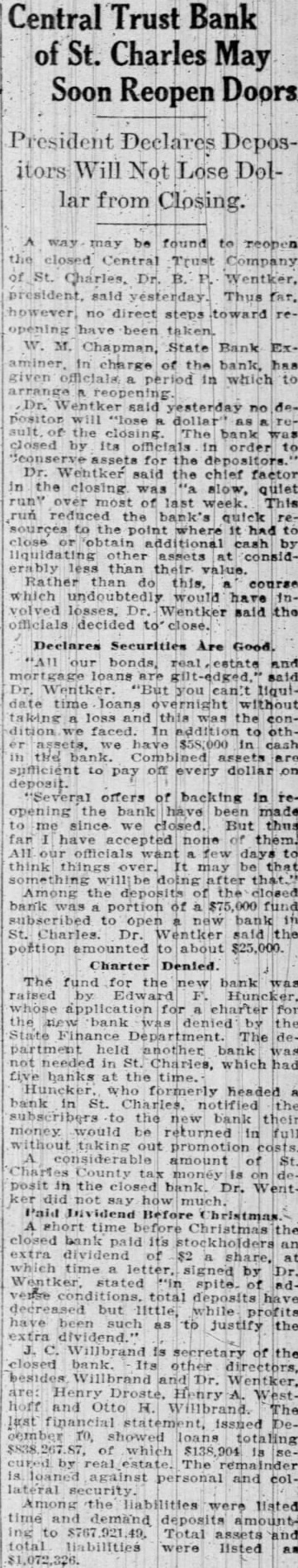 The Central Trust Company of Charles was closed Monday by its Board of Directors on account of slow The bank had steady run. capital stock of $100,000, deposits and loans of $838,267. Dr. Wentker is president and Willbrand secretary of the company. Wentker depositors will Dr. says lose dollar. Frank Cullom's store in St. Charles broken into early one last week, and $500 worth ing was stolen. Bloebaum was appointed Finance Commissioner and Deputy placed in charge of the liquidation of the Citizens Bank at Wentzville. Caleb Conley Dula, the board of directors of the Liggett Myers Tobacco Company, died December 25 at his home New York at the of 66 years. City age Born in North Carolina, Mr. Dula came to Missouri as young man and with brother opened to Wentzville. At the bacco factory at of he was made manager St. Charles and his rise factory in rapid. At the to was of married Miss Julia age Womack They had no children, but Mr. Dula helped number of men and women young through college and was deeply terested in education. His estate estimated to be worth more than Hanne of Weldon Married: Lloyd Springs and Miss Martha Hayes St. Charles. Sister Annunciata of Deaths: Institute, O'Fallon; Mrs. Mary's Huncker, 91, Marion Amelia Needham, Jenkins, 46, all of St. Otto Pundmann, Charles: Robt. Moseley, of Louis, formerly of Wentzville.