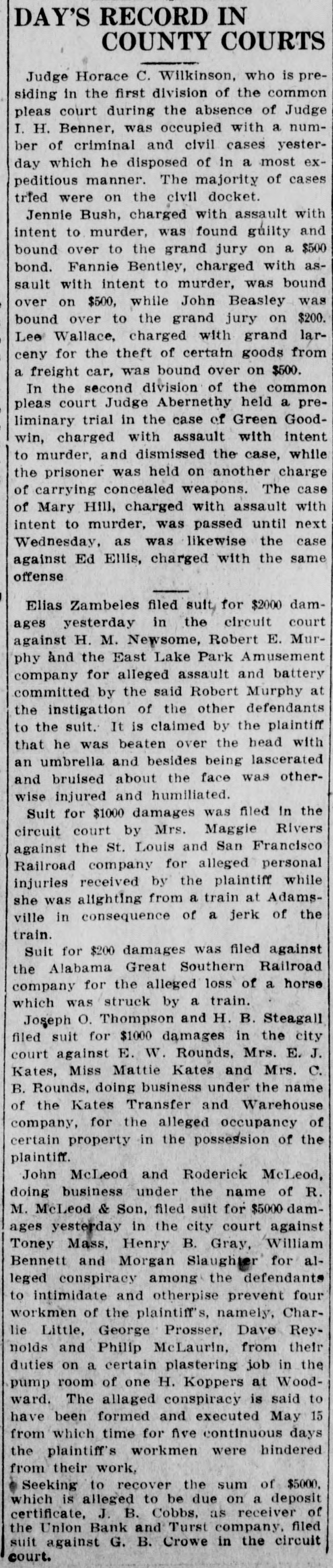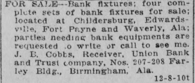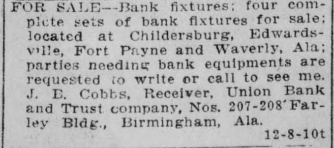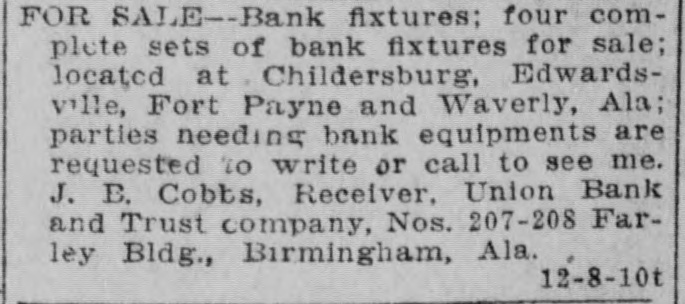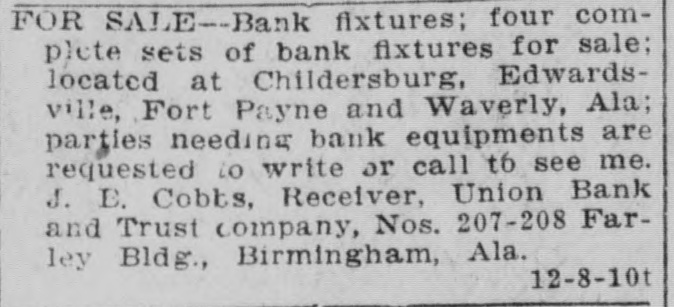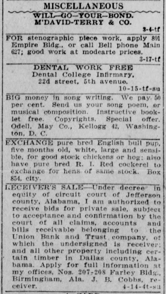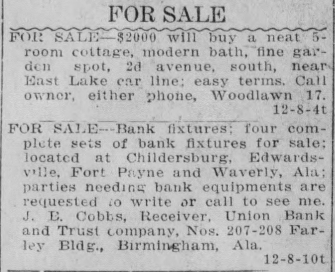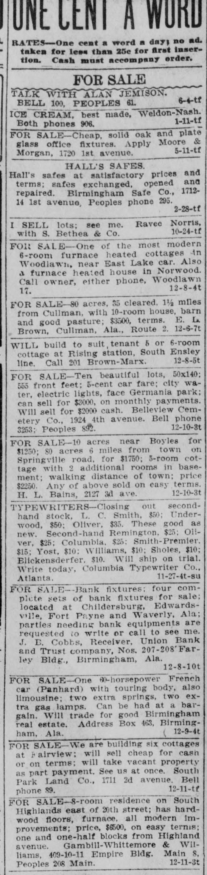 ONE CENT A WURD RATES-One cent a word a day; no ad. taken for less than 25c for first insertion. Cash must accompany order. FOR SALE TALK WITH ALAN JEMISON. 6-4-tf BELL 100, PEOPLES 61. ICE CREAM, best niade, Weldon-Nash. 1-11-tf Both phones 906. FOR SALE-Cheap, solid oak and plate glass office fixtures. Apply Moore & 5-11-tf Morgan, 1720 1st avenue. HALL'S SAFES. Hall's safes at satisfactory prices and terms; safes exchanged, opened and repaired. Birmingham Safe Co., 171214 1st avenue, Peoples phone 295. 2-28-tf I SELL lots; see me. Ravee Norris, 10-24-tf with S. Bethea & Co. FOR SALE-One of the most modern 6-room furnace heated cottages in Woodlawn, near East Lake car. Also a furnace heated house in Norwood. Call owner, either phone, Woodlawn 12-8-4t 17. FOR SALE-80 acres, 35 cleared, 1 1/2 miles from Cullman, with 10-room house, barn and good pasture; $3500, terms. E. La. Brown, Cullman, Ala., Route 2. 12-6-7t WILL build to suit tenant 5 or 6-room cottage at Rising station, South Ensley 12-8-5t line. Call 201 Brown-Marx. FOR SALE-Ten beautiful lots, 50x140; 555 front feet; 5-cent car fare; city water, electric lights, face Germania park; can sell for $3000, on monthly payments. Will sell for $2000 cash. Belleview Cemetery Co., 1924 4th avenue. Bell phone 12-10-3t 3253; Peoples 892. FOR SALE-10 acres near Boyles for $1250; 80 acres 6 miles from town on Springville road, for $1750; 5-room cottage with 2 additional rooms in basement; walking distance of town; price $2250. Any of above sold on easy terms. 12-10-3t H. L. Bains, 2127 3d ave. TYPEWRITERS-Closing out secondhand stock, L. C. Smith, $50; Underwood, $50; Oliver, $35. These good as new. Second-hand Remington, $25; Oliver, $25 Columbia, $25: Smith-Premier. $15; Yost, $10: Williams, $10; Sholes, $10; Blickensderfer. $10. Will ship on trial. Write today, Columbia Typewriter Co., 11-27-4t-su Atlanta. FOR SALE-Bank fixtures: four compiete sets of bank fixtures for sale: located at Childersburg, Edwardsville, Fort Payne and Waverly, Ala; parties needing bank equipments are requested to write or call to see me. J. E. Cobbs, Receiver, Union Bank and Trust company, Nos. 207-208 Farley Bldg., Birmingham, Ala. 12-8-10t FOR SALE-One 60-horsepower French car (Panhard) with touring body, also limousine; two extra springs, two extra gas lamps. Can be had at a bargain. Will trade for good Birmingham real estate. Address Box 463, Birming( 12-9-4t ham, Ala. FOR SALE-We are building six cottages at Fairview: will sell cheap for cash or on terms; will take vacant property as part payment. See us at once. South Park Land Co., 1711 2d avenue, Bell 12-11-tf phone 89. FOR SALE-8-room residence on South Highlands east of 20th street; has hardwood floors, furnace, all modern improvements; price, $6500, on easy ternis; one and one-half blocks from Highland avenue. Gambill-Whittemore & Williams, 409-10-11 Empire Bldg. Main 8, 12-11-3t Peoples 208 Main.