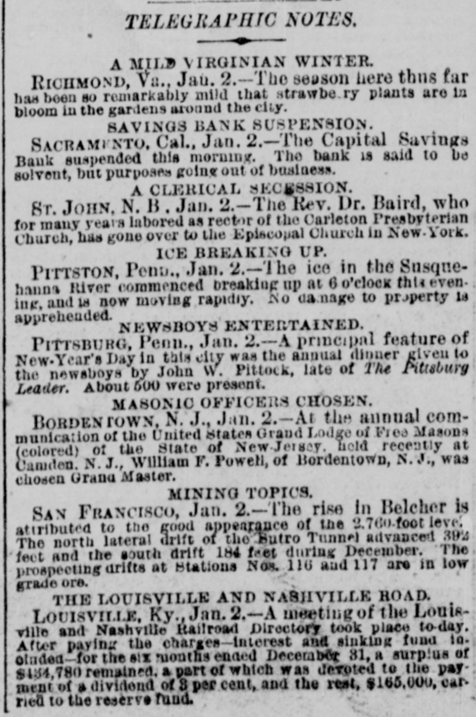CITY RAILWAY SUIT. Complaint of Stockholders Domanded. Yesterday L. S. Taylor and Grove L. Johnson, attorneys on behalf of Geo. O. Bates, M. M. Odell and the stockholders of the City Railway Company, plaintiffs, filed a complaint against the Sacramento City Railway Company, the Capital Savings Bank, W. L. Pritchard, J. H. Miller, George Cowles, C. Zimmerman, A. J. Painter, T. J. Clunie, E. K. Alsip, Peter McGraw, J. H. Downer, John Doe and Richard Roe, defendants. COMPLAINTS AND CHARGES. The following is a synopsis of the charges and complaints made: The Sacramento City Railway Company was incorporated in 1870, with a capital stock of $250,000, divided into shares of the value of $100 each, some of which became the property of plaintiffs. In 1877 the company owned 14.65 acres of land near East Park, and block of land between F. G. Twenty eighth and Twenty. streets, and tracts 3. and 5 of Watson's addition also, lot 3 in the square bounded by K,L, Tenth and Eleventh streets. It also owned the street railways throughout the city, 20 ears, 60 head of horses and other property. In 1876 W. L. Pritchard became the owner of a controlling interest in the company, and has ever since defrauded the defendants and the company. In pursuance of a system of fraud he PRETENDED TO TRANSFER CERTAIN SHARES OF STOCK To J. H. Miller, C. Zimmerman, George Cowles, A. J. Painter, Peter McGraw, E. K. Alsip, and Levi Wilson, now deceased, in order that they might be eligible to the position of Directors, and then caused them and himself to be elected when neither of them held any stock. They failed to exercise their powers as Directors and allowed Mr. Pritchard to use their names. Messrs. Pritchard & Miller have together colluded and cheated the company. They caused to be conveyed to T. J. Clunie by the company certain pieces of the real estate above described, for the sum of $11,800. The transfer was unauthorized by the defendants and was fraudulently executed. The MONEY WAS NEVER ACCOUNTED FOR To the defendants, and was converted to the use of the said Pritchard, with the assistance of the said Miller and Clunie. W. L. Pritchard, in November, 1877. caused to be transferred to himself lot 3, in the block between Tenth, Eleventh, K and L streets, for 000. and, being at that time a Director, had no right to do 80, nor was any order made from the Directors for the transfer, neither was the sum paid to the company. He also sold, delivered and charged to the company about 50 horses at $400 each, when their value was only $100 each, thus making $15,000, in which transaction he was assisted by J. H. Miller. They also sold and charged to the company grain and feed at AN EXTRAVAGANT PRICE. Between June 1, 1876. and December 1, 1879, the company did business to the amount of at least $30,000, but Miller and Pritchard have refused to render any accounts or make any dividends. In January, 1878, they executed to J. H. Downer a mortgage signed The Sacramento City Railway Company, by Edwin K. Alsip, President, and J. H. Miller, Secretary, by which it was intended to convey all the street railway in the city, also the personal property, knowing that Downer was irresponsible. This was done to enable Pritchard, by foreclosure of transfer of the pretended mortgage to get the absolute OWNERSHIP OF THE PROPERTY. He did then procure the Capital Bank's assistance, and Downer assigned the mortgage to the bank. The bank then falsely pretended to own the mortgage and began a pretended suit against the company for a foreclosure. All of the negotiations were made without the knowledge or direction of the Directors. A sham defense was begun, but judgment was allowed without an objection from the defense, and the mortgage was foreclosed. No notice of the judgment was given to stockholders, nor was any meeting of Directors called, or effort made to relieve the company from the judgment. A BOGUS SALE. In pursuance of the decree the property was sold December 1, 1879, by the Commissioner, Charles N. Post, a clerk in the office of Haymond & Allen, the attorneys hired by Pritchard to make the sham defense, for a merely nominal sum, and a bill of sale was given to J. L. Orcutt, through the Capital Savings Bank, who now pretends to be the owner of the property. The sale, however, was not genuine, as Orcutt never intended and did not pay any price, and all receipts of the transaction are false. It was the method adopted by Pritchard to get possession of the property, and he and Miller have continued to manage and use the property, levoting the proceeds to the benefit of Pritchard. They have made no reports to the Directors, who have not attempted to exercise any control over the business. HEAVY ASSESSMENTS Were levied upon the stock, so as to cause stockholders to sell their shares, and such assessments were not legally made. The proceeds were not used for the benefit of the company, nor did he pay assessments on his own stock. The plaintiffs in the case requested the Directors to begin suit for the recovery of the said sums of money, but met with a refusal. Messrs. Clunie, Pritchard and Orcutt were also requested to reconvey the property, but refused to do 80. Messrs. Pritchard and Miller are injuring the property by tearing up the roads and making the company liable for damages. JUDGMENT DEMANDED. The plaintiffs demand that an account be had of all receipts, disbursements and transfers that have been made that the defendants, Clunie, Pritchard and Orcutt, be compelled to reconvey the property; that the present Directors be removed and J. H. Miller, the Secretary, discharged; that the mortgage and all proceedings in connection with it be declared void. They also demand that the defendants be restrained from managing or interfering with the property: that a receiver be appointed to conduct the business, pending a decision in the case that the said Pritchard and Miller be ordered to pay the receiver any money due the company, and that defendants also