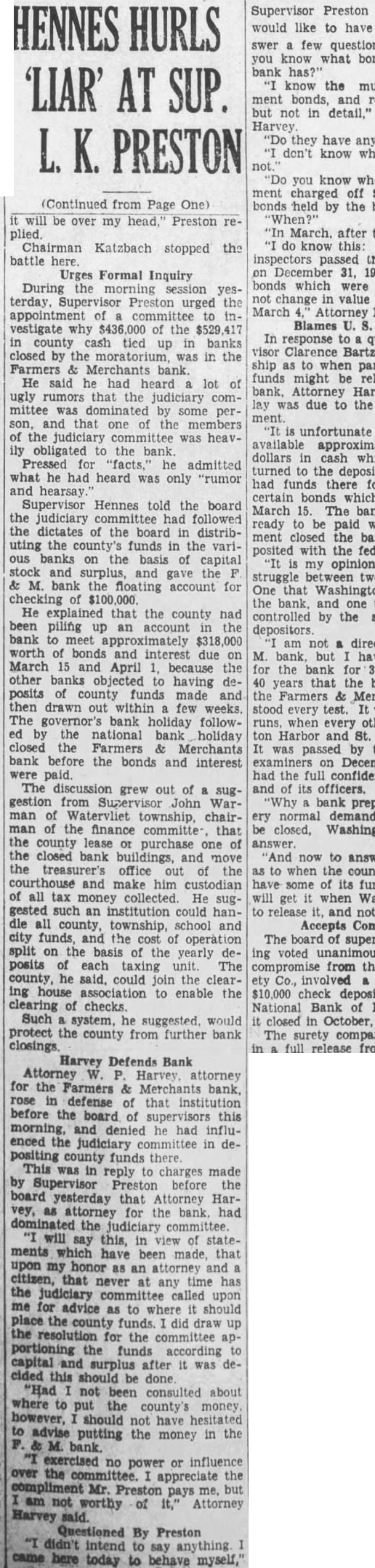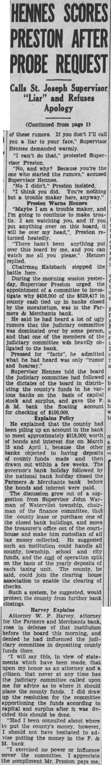 HENNES SCORES PRESTON AFTER PROBE REQUEST Calls St. Joseph Supervisor "Liar" and Refuses Apology (Continued from page 1) of these rumors. If you don't I'll call you liar to your face," Supervisor Hennes demanded warmly. "I can't do that," protested Supervisor Preston. "No, and why? Because you're the one who started the rumors,' accused Supervisor Hennes. "No didn't,' Preston insisted. "I think you did. You're nothing but a trouble maker here, anyway.' Preston Warns Hennes "Maybe am trouble maker, and I'm going to continue to make trouam watching you, and if you anything over this board, it will be over head,". Preston returned heatedly. "There hasn't been anything put over this board by me, and can watch me all you please," Hennes replied. Chairman Katzbach stopped the battle here. During the morning session yesterday, Supervisor Preston urged the of investigate why $436,000 of the $529,417 in county cash tied up in banks closed by the moratorium, was in the Farmers & Merchants bank. He said he had heard lot of ugly rumors that the judiciary committee was dominated over by some person, and that one of the of the judiciary committee was heavily obligated to the Pressed for "facts". he admitted what he had heard was only "rumor and hearsay. Supervisor Hennes told the board the judiciary had followed the dictates of the board in distributing the county's funds in he various banks on the basis of capital stock and surplus, and gave the & bank the floating account for checking of $100,000 Explains Policy He explained that the county had been piling up an account in the bank to meet approximately $318,000 worth bonds and interest due on March 15 and April because the other banks objected to having deposits of county funds made and then drawn out within few weeks. The governor's bank holiday followed the national bank holiday closed the Farmers & Merchants bank before the bonds and interest were paid. The discussion grew out of suggestion from Supervisor John Warman of Watervliet township, chairman of the finance committee, that the county lease or purchase one of the closed bank buildings, and move the treasurer's office out of the courthouse and make him custodian of all tax money collected. He suggested such an institution could handle all county, township, school and city funds, and the cost of operation split on the basis of the yearly deposits of each taxing unit. The county, he said, could join the clearing house association to enable the clearing of checks. Such system, he suggested, would protect the county from further bank closings. Harvey Explains Attorney W. P. Harvey, attorney for the Farmers and Merchants bank, rose in defense of that institution before the board this morning, and denied had influenced the judiciary committee in depositing county funds "I will say this, in view of statements which have been made, that upon my honor as an attorney and citizen. that never at any time has the judiciary committee called upon me for advice as to where it should place the county funds. did draw up the resolution for the committee apportioning the funds according to capital and surplus after it was decided this should be done. "Had been consulted about where to put the county's money, however, should not have hesitated to advise putting the money in the M. bank "I exercised no power or influence oover appreciate the compliment Mr. Preston pays me,