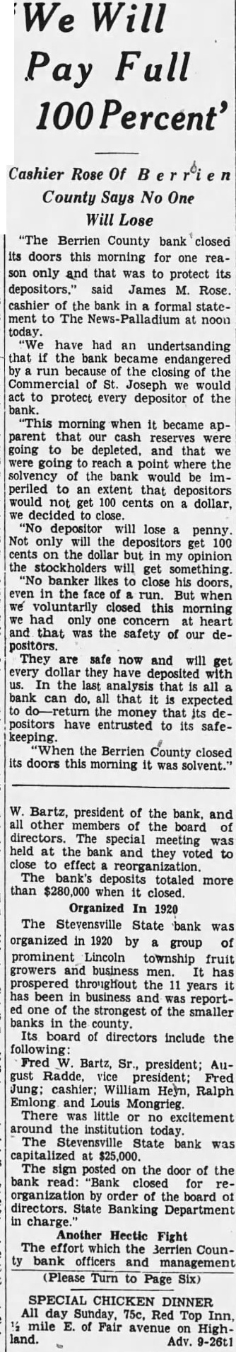 We Will Pay Full Percent' Cashier Rose Of County Says No One Will Lose "The Berrien County bank closed its doors this morning for one reason only and that was to protect its depositors," said James M. Rose. cashier of the bank in a formal statement to The News-Palladium at noon today. "We have had an undertsanding that if the bank became endangered by run because of the closing of the Commercial of St. Joseph we would act to protect every depositor of the bank. "This morning when it became apparent that our cash reserves were going to be depleted. and that we were going reach point where the solvency of the bank would be imperiled to an extent that depositors would not get 100 cents on a dollar, we decided close. "No depositor will lose a penny Not only will the depositors get 100 cents on the dollar but in my opinion the stockholders will get something. "No banker likes to close his doors, even in the face of run. But when we voluntarily closed this morning we had only one concern at heart and that was the safety of our depositors. They are safe now and will get every dollar they have deposited with In the last analysis that is all bank can do, all that it is expected to do-return the money that its depositors have entrusted to its safe"When the Berrien County closed its doors this morning it was solvent." W. Bartz, president of the bank, and all other members of the board of directors. The special meeting was held at the bank and they voted to close to effect reorganization. The bank's deposits totaled more than $280,000 when it closed. Organized In 1920 The Stevensville State bank was organized in 1920 by a group of prominent Lincoln township fruit growers and business men. It has prospered throughout the 11 years it has been in business and was reported one of the strongest of the smaller banks in the county. Its board of directors include the Fred W. Bartz, Sr., president; August Radde. vice president; Fred Jung; cashier; William Heyn, Ralph Emlong and Louis Mongrieg. There was little or no excitement around the institution today. The Stevensville State bank was capitalized at $25,000. The sign posted on the door of the bank read: "Bank closed for reorganization order of the board of directors. State Banking Department charge. Another Hectic Fight The effort which the Berrien County bank officers and management (Please Turn to Page Six) SPECIAL CHICKEN DINNER All day Sunday, 75c, Red Top Inn, mile E. of Fair avenue on Highland. Adv. 9-26t1