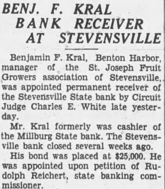 Benjamin Kral ... was appointed receiver of the Stevensville State bank by Circuit Judge Charles White late yesterday. ... The Stevensville bank closed several weeks ago. He was appointed upon petition of Rudolph Reichert, state banking commissioner. (article dated 1931-11-03).