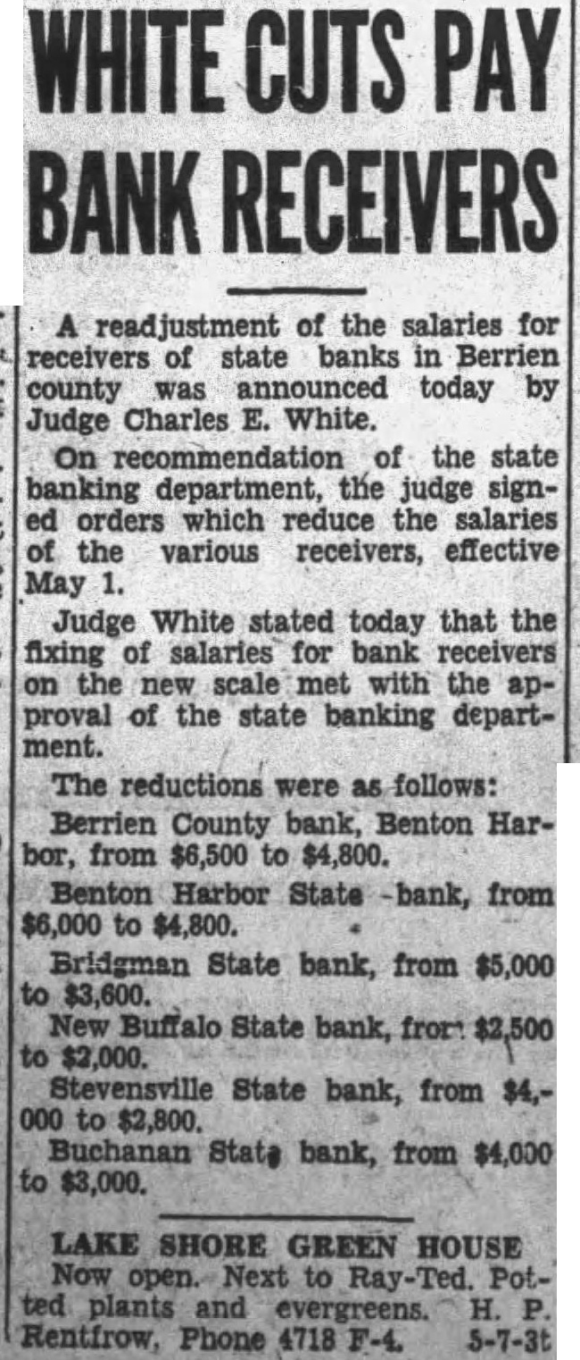 WHITE CUTS PAY BANK RECEIVERS A readjustment of the salaries for receivers of state banks in Berrien county today by Judge Charles E. White. On recommendation of the state banking department, the judge signorders which reduce the salaries the various receivers, effective May Judge White stated today that the fixing of salaries for bank receivers on the new scale met with the approval of the state banking department. The reductions were as follows: Berrien County bank, Benton Harbor, from $6,500 to $4,800. Benton Harbor State bank, from $6,000 to $4,800. Bridgman State bank, from $5,000 to $3,600. New Buffalo State bank, from $2,500 to $2,000. Stevensville State bank, from $4,000 to $2,800. Buchanan State bank, from $4,000 to $3,000. LAKE SHORE GREEN HOUSE Now open. Next to Potted plants and evergreens. Rentfrow, Phone 5-7-3t
