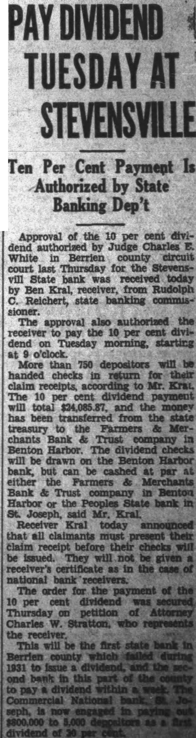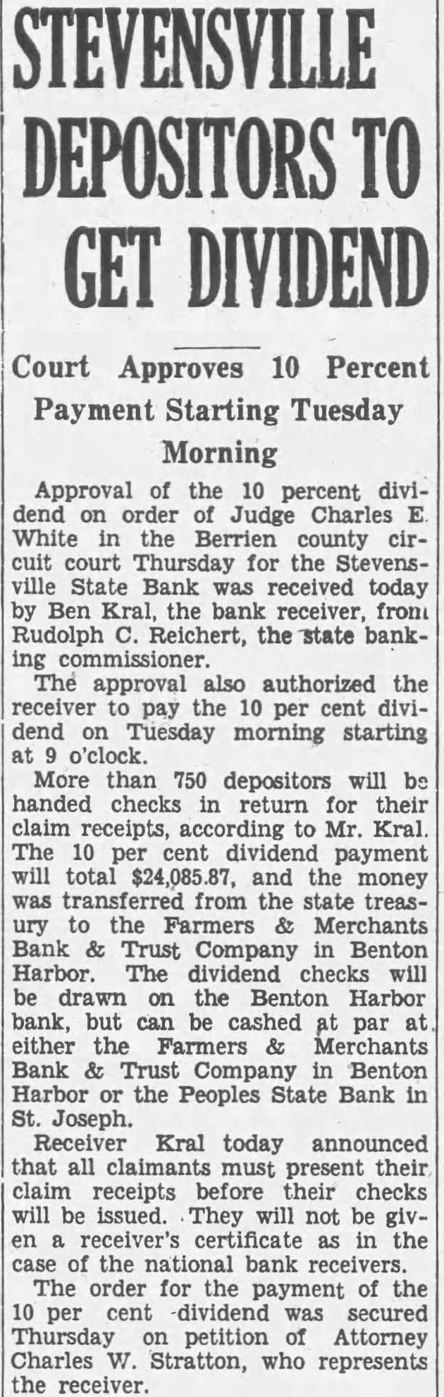 STEVENSVILLE DEPOSITORS DIVIDEND Court Approves 10 Percent Payment Starting Tuesday Morning Approval of the 10 percent dividend on order Judge Charles White in the Berrien county circourt Thursday the Stevensville State Bank was received today Ben Kral, the bank receiver, from Rudolph Reichert, the state bankcommissioner. The approval also authorized the receiver pay the per cent dividend Tuesday morning starting o'clock. More than 750 depositors will be handed checks in return their claim receipts, according Mr. Kral The 10 cent dividend payment will total and the money was transferred from the state treasFarmers Merchants Bank Trust Company in Benton Harbor. The dividend checks will drawn on the Benton Harbor bank, but can be cashed par either the Farmers Merchants Bank Trust Company in Benton Harbor the Peoples State Bank Joseph. Receiver Kral today announced claimants must present their claim receipts their checks will issued. They will not be in the the bank receivers. The order for the payment of the per cent dividend was Thursday petition Attorney Charles Stratton, who represents the receiver.