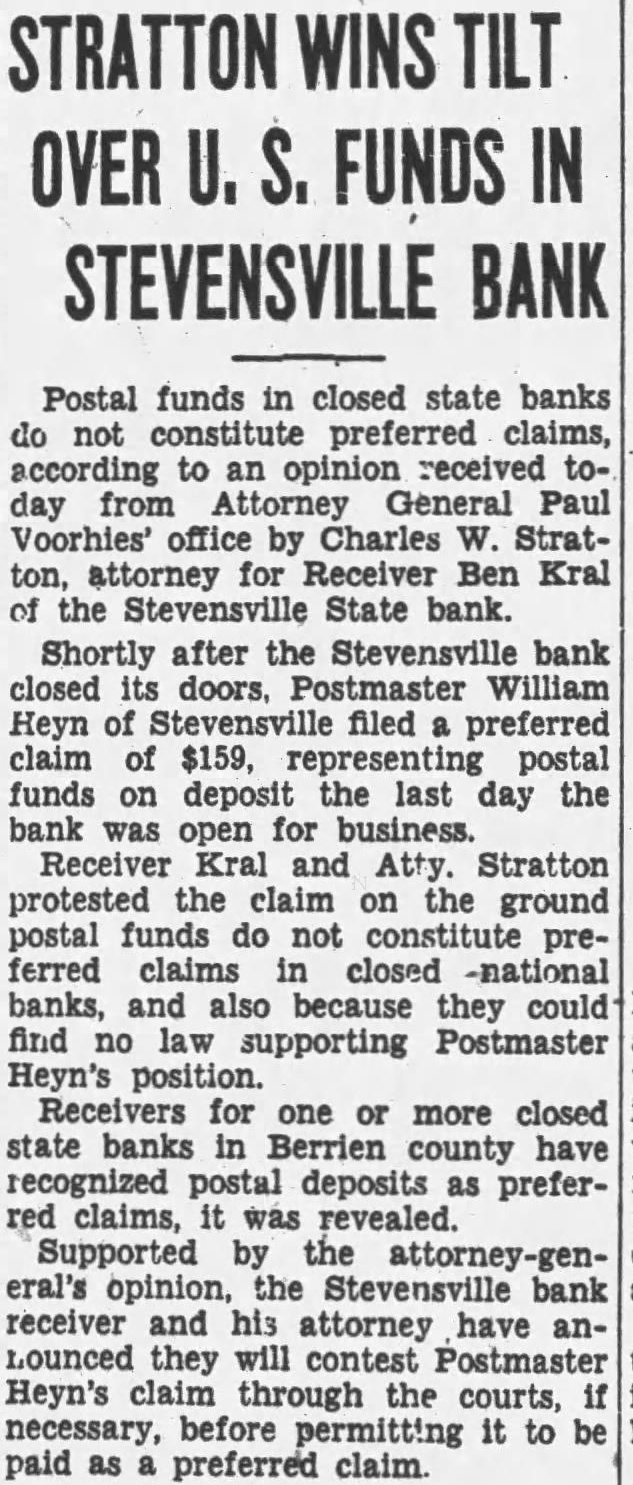 STRATTON TILT FUNDS IN STEVENSVILLE BANK Postal funds in closed state banks do not claims, to an opinion received day from General Paul Voorhies' office by Charles Stratton, for Receiver Kral the Stevensville State bank. Shortly after the Stevensville bank closed its doors, Postmaster William Heyn of Stevensville filed preferred claim of $159, representing postal funds on deposit the last day the bank was open for business. Receiver Kral and Atty. Stratton protested the claim on the ground postal funds do not constitute preferred claims closed -national banks, and also because they could find no law supporting Postmaster Heyn's position. Receivers for one or more closed state banks Berrien county have recognized postal deposits as preferred claims, was revealed. Supported the eral's opinion, the Stevensville bank receiver and his attorney have anLounced they contest Postmaster Heyn's claim through the courts, necessary, before permitting it to be paid as preferred claim.