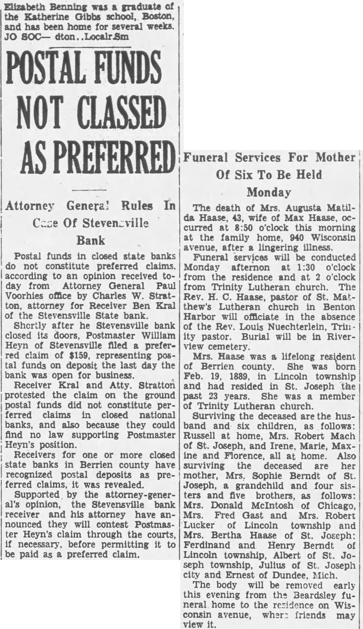Attorney General Rules In Case Of Bank Postal funds in closed state banks not preferred claims. according to an opinion received day from General Paul Voorhies office by Charles Stratton, attorney for Receiver Ben Kral the Stevensville State bank. Shortly after Stevensville bank closed its doors, Postmaster William Heyn filed preferred claim $159, postal funds deposit the last day the open for Receiver Kral and Atty. Stratton protested the on the ground postal funds did not per ferred claims closed banks, and because they could find no law supporting Postmaster Heyn's position. Receivers for one or more closed state banks in Berrien county have postal deposits preferred revealed. Supported by the al's opinion, Stevensville bank receiver and his attorney have announced they will contest PostmasHeyn's claim through the courts, before paid preferred claim. Funeral Services For Mother Of Six To Be Held Monday The death of Mrs. Augusta Matilda Haase, wife of Max Haase, curred o'clock this morning at the family home, Wisconsin avenue, after lingering illness. Funeral services conducted Monday afternon o'clock from the residence o'clock from Trinity Lutheran church. The Rev. Haase, pastor of Matthew's Lutheran church Benton Harbor will officiate in the absence of the Rev. Louis Trin ity pastor. Burial will be in Rivercemetery. Mrs. Haase was lifelong resident county. She was born Feb. 1889, Lincoln township and had resided in St. Joseph the past years. She was member Trinity church. the deceased the husband and six children, follows: Russell home, Mrs. Robert Mach of Joseph, and Irene, Marie, Maxine and all home. Also surviving the are her mother, Mrs. Sophie Berndt of Joseph, and four five brothers, follows: Donald McIntosh Chicago, Mrs. Fred Gast and Mrs. Robert Lucker Lincoln township and Mrs. Bertha Haase of Joseph: and Henry Berndt Lincoln township, Albert Jo. seph Joseph and Ernest Dundee, Mich. The body will be removed early this evening from the neral home the on consin avenue, where friends may