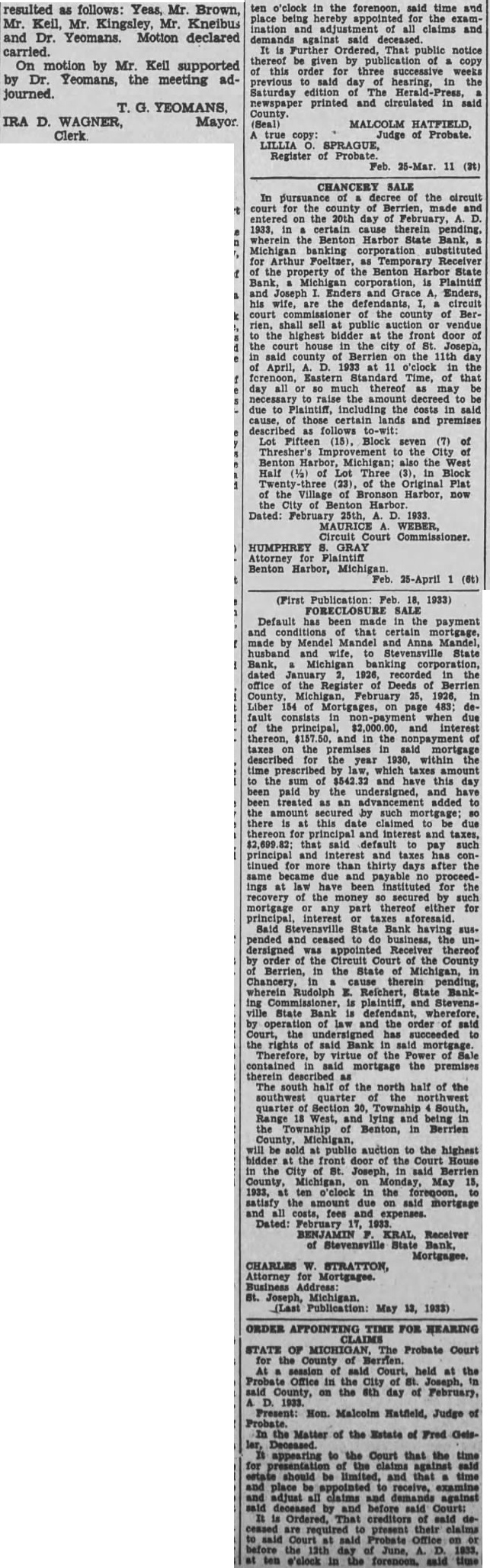 resulted as follows: Yeas, Mr. Brown, Mr. Mr. Mr. Kneibus and Dr. Yeomans. Motion declared carried. On by Mr. Keil supported by Dr. Yeomans, the meeting adjourned. G. YEOMANS, IRA D. WAGNER, Mayor Clerk o'clock forenoon, said time and for the all claims and said thereof copy of this successive day hearing, Saturday The printed and circulated in said (Seal) MALCOLM of Probate. SPRAGUE, Register 11 (3t) In the circuit and day February, the Harbor banking substituted for Tempora Receiver the the Benton Harbor Plaintiff Enders, his circuit the rien, the the the said 11th April, in day thereof may amount due to the costs those and premises as Fifteen Block seven (7) of the City also the Lot the Original Plat the Harbor, now the WEBER, Circuit Commissioner. HUMPHREY 25-April (6t) (First Publication: 1933) FORECLOSURE SALE Default payment that mortgage, made by and Mandel and State 1926, recorded the 1926, Liber 154 Mortgages, on page 483; in the the premises described the within time the sum $542.32 and have this day been paid the undersigned, and an by so there this and that said pay thirty days after same due and ings at law instituted for the secured mortgage part State having and do dersigned Receiver the the wherein Rudolph M and ville State the Court, the has the said said the contained the half the north half of the 18 West, and lying and the in sold the highest the the City May 15, 1933, the to the amount due on said mortgage and February Receiver Stevensville Bank, Mortgagee. CHARLES STRATTON, Attorney St. Joseph, Michigan. (Last Publication May 13, 1933) ORDER APPOINTING FOR HEARING STATE OF MICHIGAN, Probate Court the said at the Office the said on the day of 1933. Present: Malcolm Hatfield, Judge of the of the Estate of Deceased. appearing to the Court that the time for be and receive, examine adjust and against and before said creditors said deare their present said the ten said
