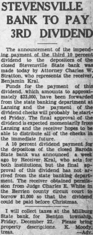 STEVENSVILLE BANK TO PAY 3RD DIVIDEND The announcement of the impendpayment of the third percent dividend the depositors of the closed State bank was made today by Attorney Charles W. Stratton. who represents the receiver, Benjamin Kral. Funds for the payment of this dividend. which amounts approximately $23,000, have been forwarded from the state banking department at Lansing and the payment of the dividend checks will probably ed Friday. The final approval of the dividend expected momentarily from Lansing and the receiver hopes to be able to distribute all of the checks in the immediate future. 10 percent dividend payment for the depositors of the closed Baroda State bank was announced by Receiver Kral, acts both but the final approval of this dividend not rived from the state banking department. The receiver obtained permission from Judge Charles E. White in the Berrien county circuit court borrow that the dividend could be paid before Christmas. will collect taxes at the Millburg State bank, for Benton 22. Please bring property K. treas. -Adv.