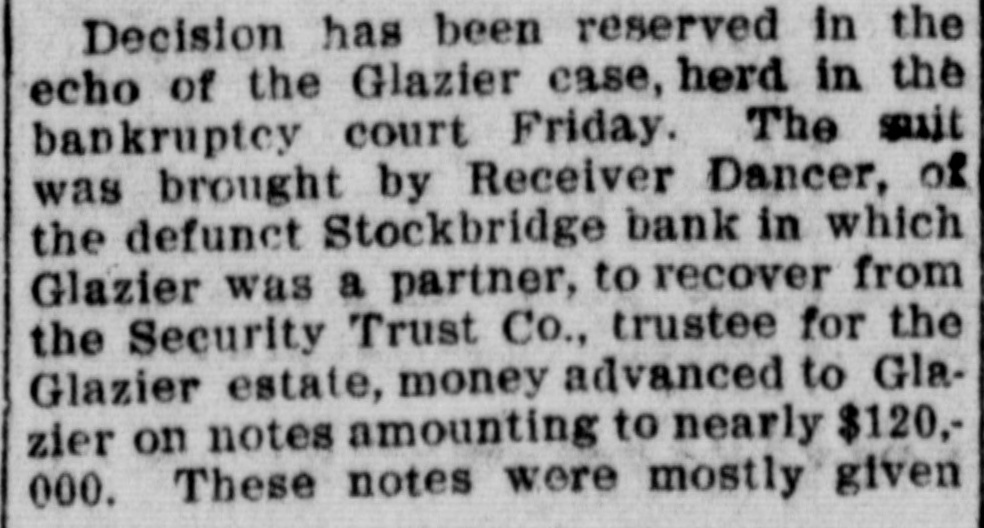 Decision has been reserved in the echo of the Glazier case, herd in the bankruptcy court Friday. The suit was brought by Receiver Dancer, of the defunct Stockbridge bank in which Glazier was a partner, to recover from the Security Trust Co., trustee for the Glazier estate, money advanced to Glazier on notes amounting to nearly $120,000. These notes were mostly given for stove company stock with the understanding that they were not to be collected, and Glazier would take back the stock if required, Glazier discounted them at his bank, taking up his own paper for them. The complainant claims recovery from Glazier because it was on account of his arrangement that the bank cannot recover from the makers. The defendants' claim that if the bank cannot recover from the makers, it cannot recover at all. One of the notes for $50,000 was signed by Mrs. Glazier, but when the bank sued she availed herself of her right as a married woman to repudiate. This note was supposedly secured by some government bonds that cannot be found. The case was argued before Referee Davock. Senator Tuttle appeared for the receiver of the Stockbridge bank, and Selling & Oxtoby for the Security Trust Co.
