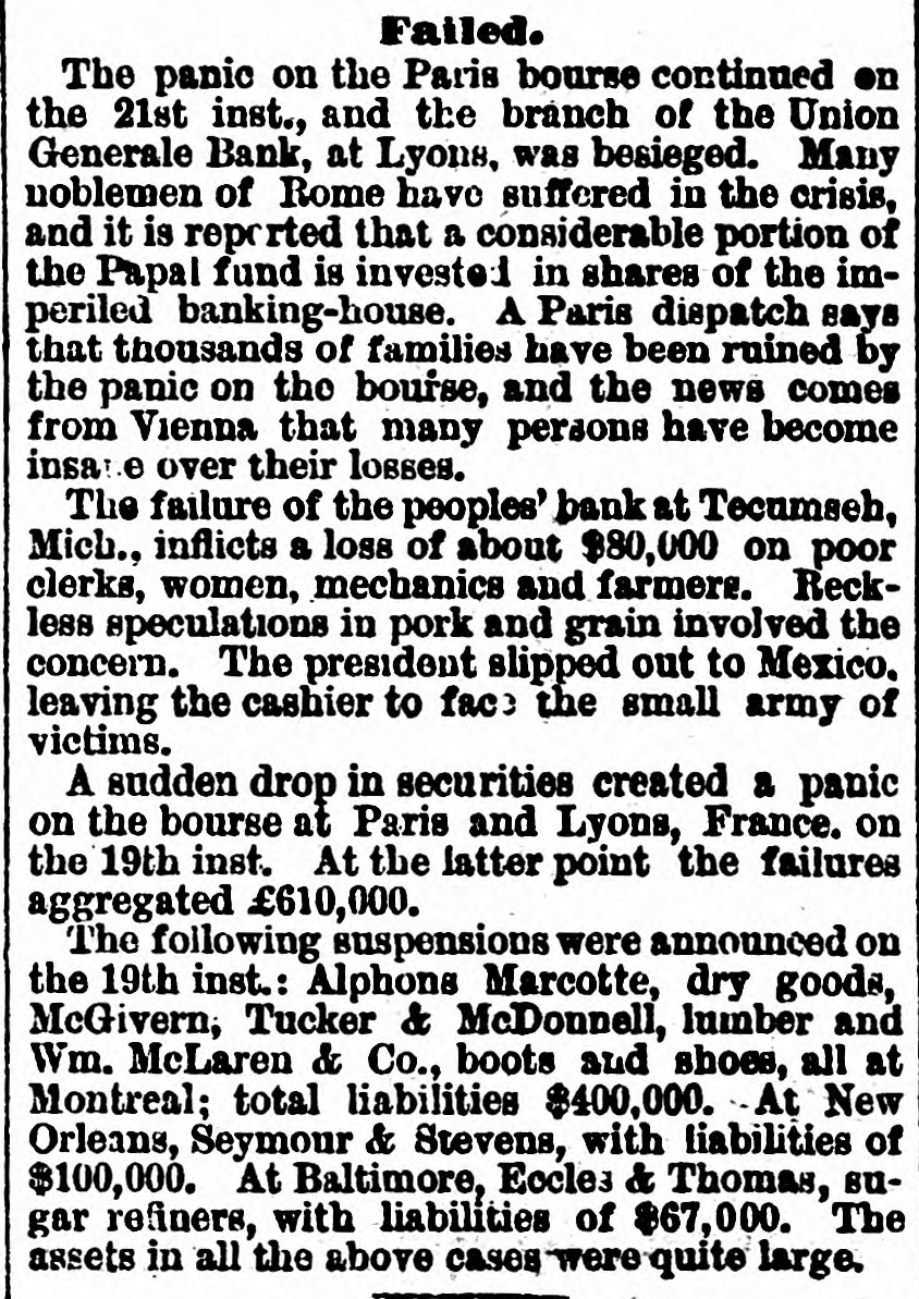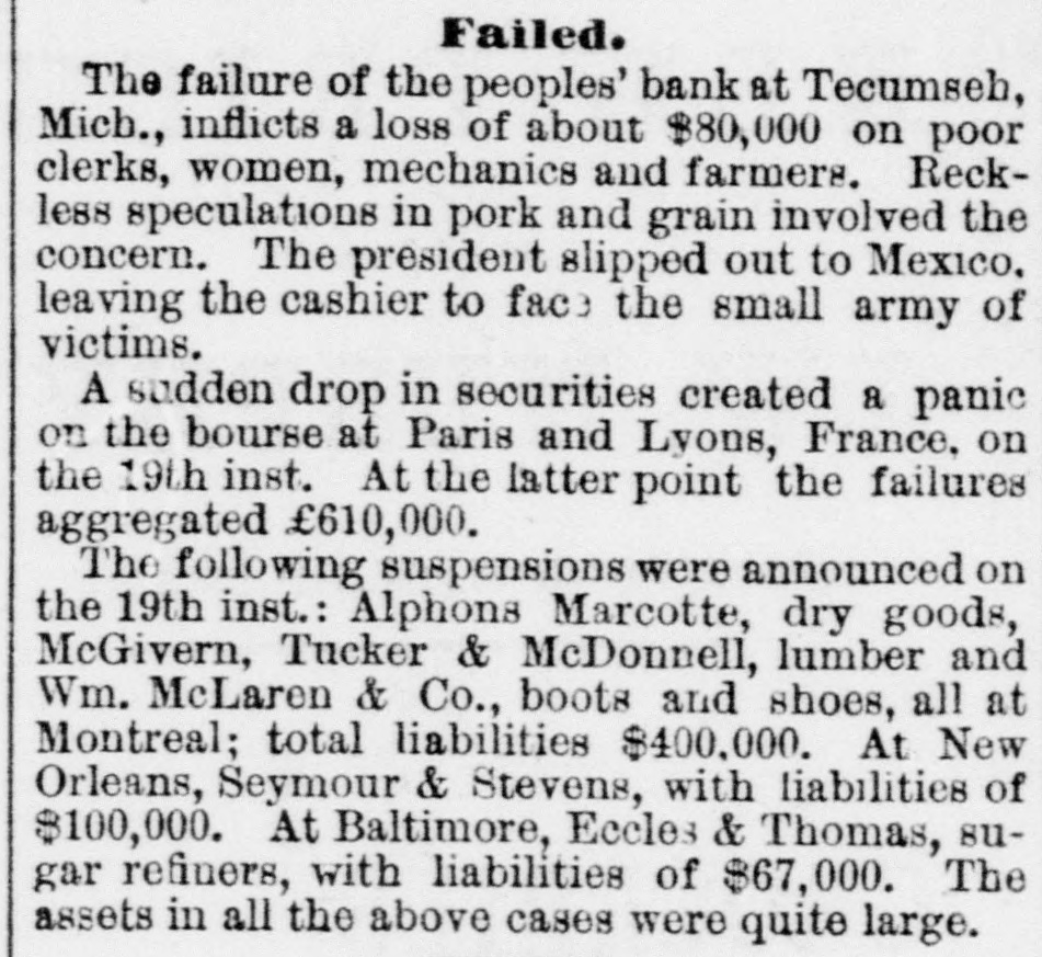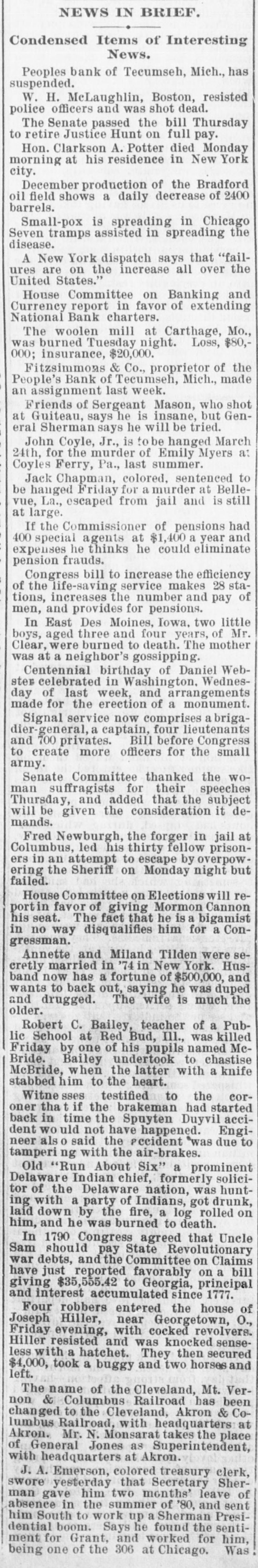 NEWS IN BRIEF. Condensed Items of Interesting News. Peoples bank of Tecumseh, Mich., has suspended. W. H. McLaughlin, Boston, resisted police officers and was shot dead. The Senate passed the bill Thursday to retire Justice Hunt on full pay. Hon. Clarkson A. Potter died Monday morning at his residence in New York city. December production of the Bradford oil field shows a daily decrease of 2400 barrels. Small-pox is spreading in Chicago Seven tramps assisted in spreading the disease. A New York dispatch says that "failures are on the increase all over the United States.' House Committee on Banking and Currency report in favor of extending National Bank charters. The woolen mill at Carthage, Mo., was burned Tuesday night. Loss, $80,000; insurance, $20,000. Fitzsimmons & Co., proprietor of the People's Bank of Tecumsel, Mich., made an assignment last week. Friends of Sergeant Mason, who shot at Guiteau, says he is insane, but General Sherman says he will be tried. John Coyle, Jr., is to be hanged March 24th, for the murder of Emily Myers a: Coyles Ferry, Pa., last summer. Jack Chapman, colored, sentenced to be hanged Friday for a murder at Bellevue, La., escaped from jail and is still at large. the had 400 at a year and If special Commissioner agents $1,400 of pensions expenses he thinks he could eliminate pension frauds. Congress bill to increase the efficiency of the life-saving service makes 28 stations, increases the number and pay of men, and provides for pensions. In East Des Moines, Iowa, two little boys, aged three and four years, of Mr. Clear, were burned to death. The mother was at a neighbor's gossipping. Centennial birthday of Daniel Webster celebrated in Washington, Wednesday of last week, and arrangements made for the erection of a monument. Signal service now comprises a brigadier-general, a captain, four lieutenants and 700 privates. Bill before Congress to create more officers for the small army. Senate Committee thanked the man suffragists and added for that their speeches woThursday, the subject will be given the consideration it demands. Fred Newburgh, the forger in jail at Columbus, led his thirty fellow prisoners in an attempt to escape by overpowering the Sheriff on Monday night but failed. House Committee on Elections will reportin favor of giving Mormon Cannon his seat. The fact that he is a bigamist in no way disqualifies him for a Congressman. Annette and Miland Tilden were secretly married in 74in New York. Husband now has a fortune of $500,000, and wants to back out, saying he was duped and drugged. The wife is much the older. Robert C. Bailey, teacher of Public at was School by Red Bud, III., a killed Friday one of his pupils named McBride. Bailey undertook to chastise McBride, when the latter with a knife stabbed him to the heart. corWitne: sses testified to the oner tha t if the brakeman had started back in time the Spuyten Duyvil accident would not have happened. Engineer als said the precident was due to tampering with the air-brakes. Old "Run About Six" a prominent chief, tor Delaware was a party of Indians, Delaware ing with of the Indian nation, formerly got drunk, solici- huntthe fire, a on he was burned him, laid down and by to log death. rolled In 1790 Congress agreed that Uncle Sam should pay State Revolutionary war debts, and the Committee on Claims have just reported on a bill to and accumulated giving interest $35,555.42 favorably Georgia, since principal 1777. entered the Joseph Four robbers Hiller, Georgetown, house of near O., Friday evening, with cocked revolvers. and was a hatchet. less Hiller with resisted They knocked then secured sense$4,000, took a buggy and two horses and left. The name of the Cleveland, Mt. VerRailroad to Akron with at changed lumbus non & Railroad, Columbus the Cleveland, headquarters has & been CoAkron. Mr. N. Monsarat takes the place of General Jones as Superintendent, with headquarters at Akron. colored J. A. Emerson, treasury clerk, SWore yesterday that Secretary Sherman gave him two months' leave of absence in the summer of '80, and sent him South to work up a Sherman Presidential boom. Says he found the sentiand worked for being ment for Grant, of the him, one 306 at Chicago. Was