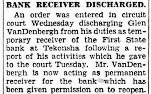 BANK RECEIVER DISCHARGED. An order was entered in circuit court Wednesday discharging Glen VanDenbergh from his duties as temporary receiver of the First State bank at Tekonsha following a report of his activities which he gave to the court Tuesday. Mr. VanDenbergh is now acting as permanent receiver for the bank which has been given permission on to reopen.