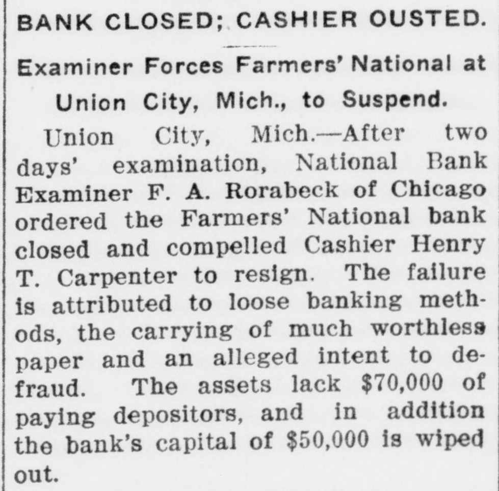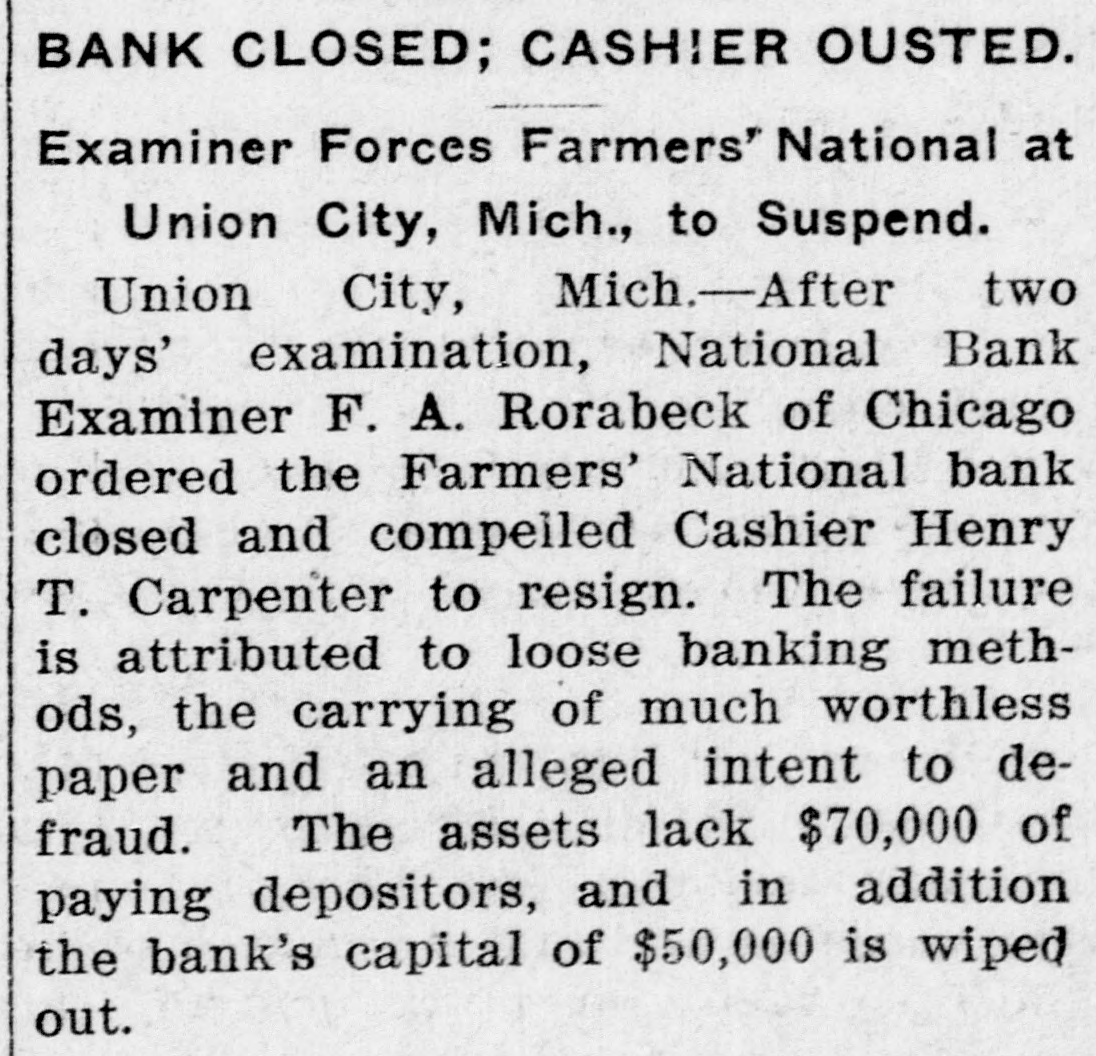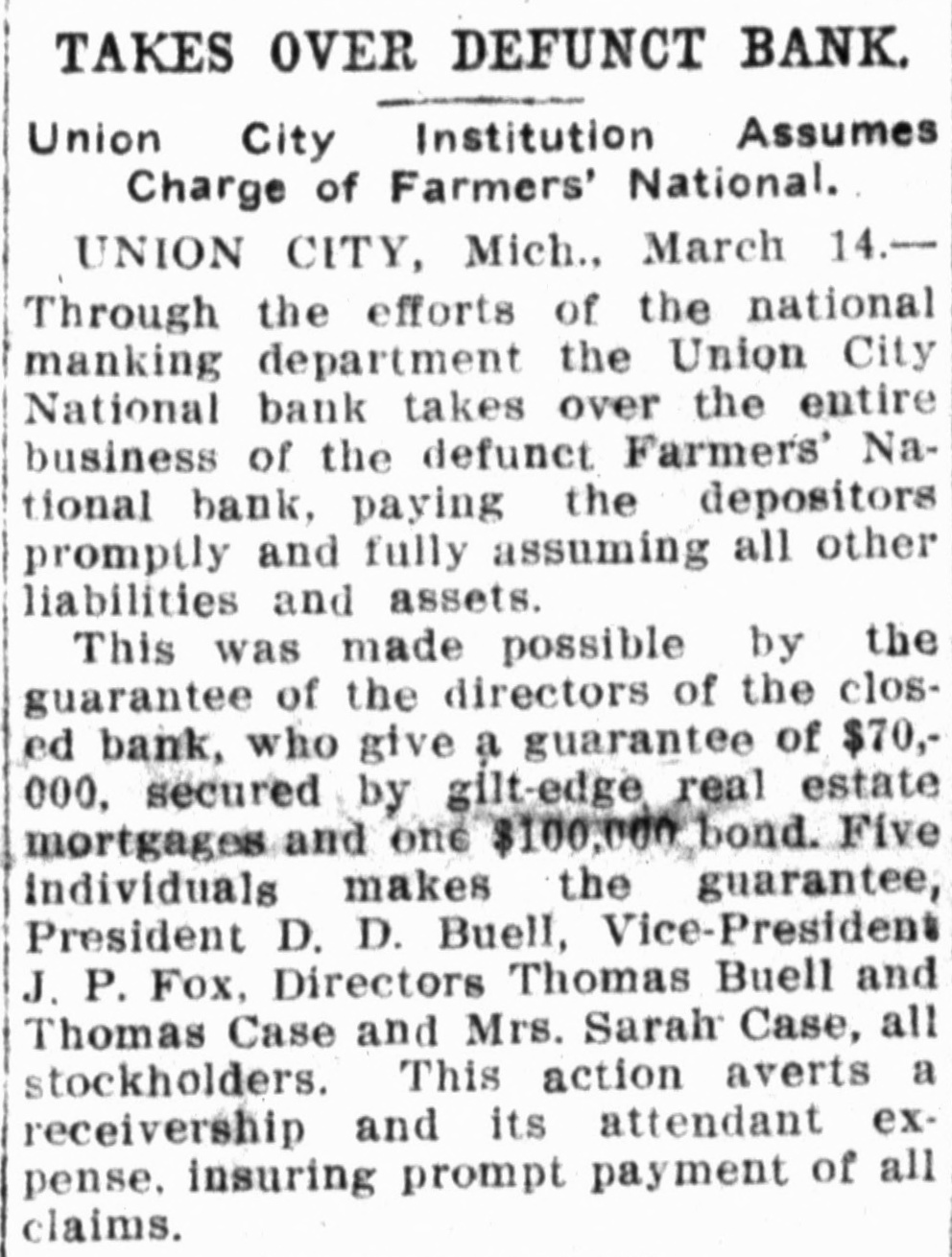 TAKES OVER DEFUNCT BANK. Assumes Institution Union City Charge of Farmers' National. UNION CITY, Mich., March 14.Through the efforts of the national manking department the Union City National bank takes over the entire business of the defunct Farmers' National bank, paying the depositors promptly and fully assuming all other liabilities and assets. This was made possible by the guarantee of the directors of the closed bank, who give a guarantee of $70,000, secured by gilt-edge real estate mortgages and one $100,000 bond. Five individuals makes the guarantee, President D. D. Buell, Vice-President J. P. Fox, Directors Thomas Buell and Thomas Case and Mrs. Sarah Case, all stockholders. This action averts a receivership and its attendant expense. insuring prompt payment of all claims.