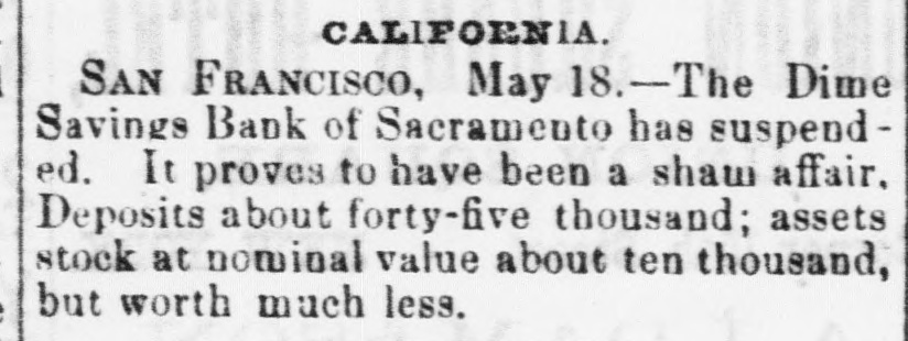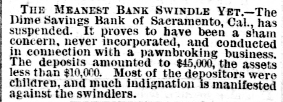The Dime savings bank of Sacramento, reported suspended yesterday, turns out to be a fraudulent concern, without a charter, and but a mere pawn-broker's shop. A great proportion of its depositors are children, and much indignation is manifested in consequence of the glaring swindle.