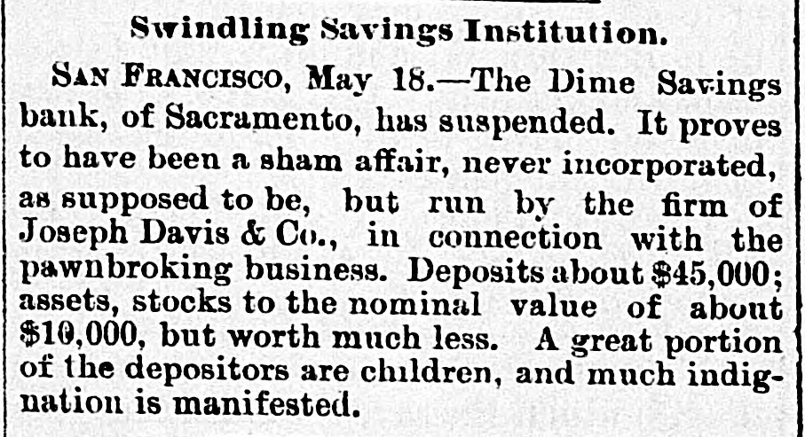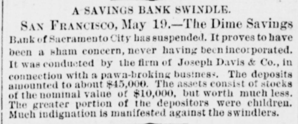 A SAVINGS BANK SWINDLE. SAN FRANCISCO, May 19.-The Dime Savings Bank of Sacramento City has suspended. It proves to have been a sham concern, never having been incorporated. It was conducted by the firm of Joseph Davis & Co., in connection with a pawn-broking business. The deposits amounted to about $45,000. The assets consist of stocks of the nominal value of $10,000, but worth much less. The greater portion of the depositors were children. Much indignation is manifested against the swindlers.