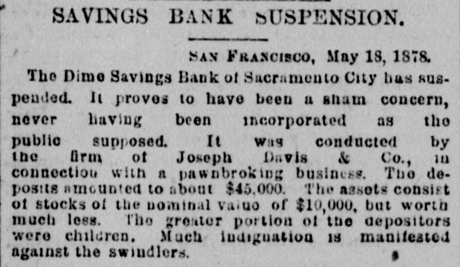 SAVINGS BANK SUSPENSION. SAN FRANCISCO, May 18, 1878. The Dime Savings Bank of Sacramento City has suspended. It proves to have been a sham concern, never having been incorporated as the public supposed. It was conducted by the firm of Joseph Davis & Co., in connection with a pawnbroking business. The deposits amounted to about $45,000. The assets consist of stocks of the nominal value of $10,000, but worth much less. The greater portion of the depositors were children. Much indignation 18 manifested against the swindlers.