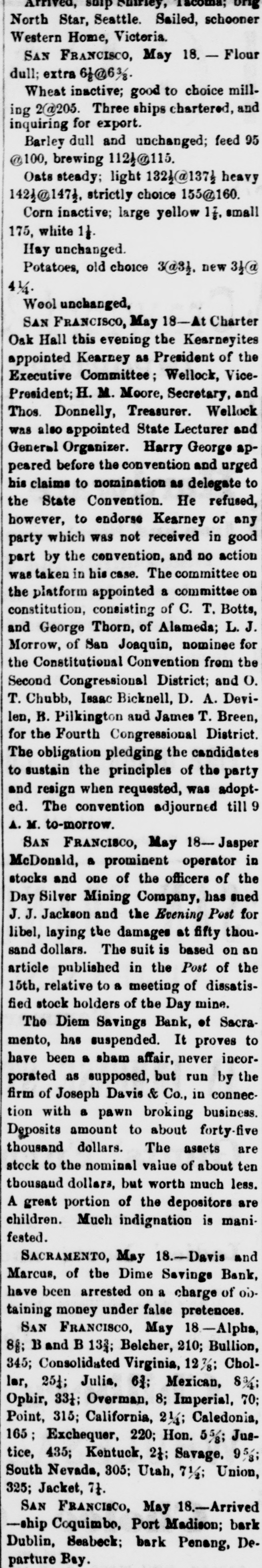 North Star, Seattle. Sailed, schooner Western Home, Victoria. SAN FRANCISCO, May 18. - Flour dull; extra 6f@6%. Wheat inactive; good to choice milling 2@205. Three ships chartered, and inquiring for export. Barley dull and unchanged; feed 95 @100, brewing 112}@115. Oats steady; light 1324@1374 heavy 1423@1474. strictly choice 155@160. Corn inactive; large yellow 1f. small 175, white 11. Hay unchanged. Potatoes, old choice 3@31, new 3}@ 41/4. Weol unchanged, SAN FRANCISCO, May 18-At Charter Oak Hall this evening the Kearneyites appointed Kearney as President of the Executive Committee; Wellock, VicePresident; H. M. Moore, Secretary, and Thos. Donnelly, Treasurer. Wellock was also appointed State Lecturer and General Organizer. Harry George appeared before the convention and urged his claims to nomination as delegate to the State Convention. He refused, however, to endorse Kearney or any party which was not received in good part by the convention, and no action was taken in his case. The committee on the platform appointed a committee on constitution, consisting of C. T. Botts, and George Thorn, of Alameda; L. J. Morrow, of San Joaquin, nominee for the Constitutional Convention from the Second Congressional District; and O. T. Chubb, Isaac Bicknell, D. A. Devilen, B. Pilkington and James T. Breen, for the Fourth Congressional District. The obligation pledging the candidates to sustain the principles of the party and resign when requested, was adopted. The convention adjourned till 9 A. M. to-morrow. SAN FRANCISCO, May 18- Jasper McDonald, a prominent operator in stocks and one of the officers of the Day Silver Mining Company, has sued J. J. Jackson and the Evening Post for libel, laying the damages at fifty thousand dollars. The suit is based on an article published in the Post of the 15th, relative to a meeting of dissatisfied stock holders of the Day mine. The Diem Savings Bank, of Sacramento, has suspended. It proves to have been a sham affair, never incorporated as supposed, but run by the firm of Joseph Davis & Co., in connection with a pawn broking business. Deposits amount to about forty-five thousand dollars. The assets are stock to the nominal value of about ten thousand dollars, but worth much less. A great portion of the depositors are children. Much indignation is manifested. SACRAMENTO, May 18.-Davis and Marcus, of the Dime Savings Bank, have been arrested on a charge of oi). taining money under false pretences. SAN FRANCISCO, May 18-Alpha, 8f; B and B 133; Belcher, 210; Bullion, 345; Consolidated Virginia, 12%; Chollar, 251; Julia, 61; Mexican, 8%; Ophir, 33}; Overman, 8; Imperial, 70; Point, 315; California, 21/4; Caledonia, 165; Exchequer, 220; Hon. 5%; Justice, 435; Kentuck, 21; Savage. 95; South Nevada, 305; Utah, 71/2; Union, 325; Jacket, 7t. SAN FRANCISCO, May 18.-Arrived -ship Coquimbe, Port Madison; bark Dublin, Seabeck; bark Penang, Departure Bay.