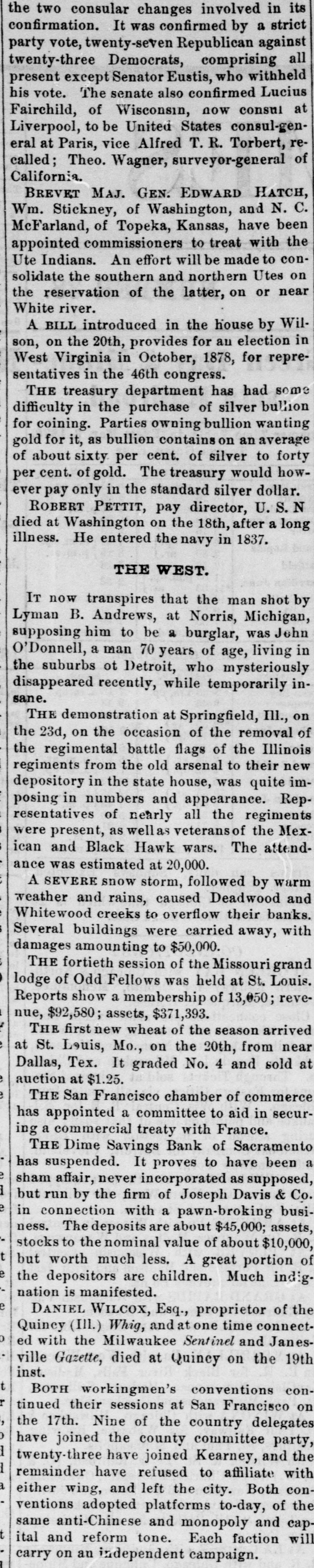 twenty-three Democrats, comprising all present except Senator Eustis, who withheld his vote. The senate also confirmed Lucius Fairchild, of Wisconsin, now consul at Liverpool, to be United States consul-general at Paris, vice Alfred T. R. Torbert, recalled; Theo. Wagner, surveyor-general of California. BREVET MAJ. GEN. EDWARD HATCH, Wm. Stickney, of Washington, and N. C. McFarland, of Topeka, Kansas, have been appointed commissioners to treat with the Ute Indians. An effort will be made to consolidate the southern and northern Utes on the reservation of the latter, on or near White river. A BILL introduced in the house by Wilson, on the 20th, provides for an election in West Virginia in October, 1878, for representatives in the 46th congress. THE treasury department has had some difficulty in the purchase of silver bullion for coining. Parties owning bullion wanting gold for it, as bullion contains on an average of about sixty per cent. of silver to forty per cent. of gold. The treasury would however pay only in the standard silver dollar. ROBERT PETTIT, pay director, U. S. N died at Washington on the 18th, after a long illness. He entered the navy in 1837. THE WEST. IT now transpires that the man shot by Lyman B. Andrews, at Norris, Michigan, supposing him to be a burglar, was John O'Donnell, a man 70 years of age, living in the suburbs ot Detroit, who mysteriously disappeared recently, while temporarily insane. THE demonstration at Springfield, Ill., on the 23d, on the occasion of the removal of the regimental battle flags of the Illinois regiments from the old arsenal to their new depository in the state house, was quite imposing in numbers and appearance. Representatives of nearly all the regiments were present, as wellas veteransof the Mexican and Black Hawk wars. The attendance was estimated at 20,000. A SEVERE snow storm, followed by warm weather and rains, caused Deadwood and Whitewood creeks to overflow their banks. Several buildings were carried away, with damages amounting to $50,000. THE fortieth session of the Missouri grand lodge of Odd Fellows was held at St. Louis. Reports show a membership of 13,050; revenue, $92,580; assets, $371,393. THE first new wheat of the season arrived at St. Louis, Mo., on the 20th, from near Dallas, Tex. It graded No. 4 and sold at auction at $1.25. THE San Francisco chamber of commerce has appointed a committee to aid in securing a commercial treaty with France. THE Dime Savings Bank of Sacramento has suspended. It proves to have been a sham affair, never incorporated as supposed, but run by the firm of Joseph Davis & Co. in connection with a pawn-broking business. The deposits are about $45,000; assets, stocks to the nominal value of about $10,000, but worth much less. A great portion of the depositors are children. Much indignation is manifested. DANIEL WILCOX, Esq., proprietor of the Quincy (III.) Whig, and at one time connected with the Milwaukee Sentinel and Janesville Gazette, died at Quincy on the 19th inst. BOTH workingmen's conventions continued their sessions at San Francisco on the 17th. Nine of the country delegates have joined the county committee party, twenty-three have joined Kearney, and the remainder have refused to affiliate with either wing, and left the city. Both conventions adopted platforms to-day, of the same anti-Chinese and monopoly and capital and reform tone. Each faction will