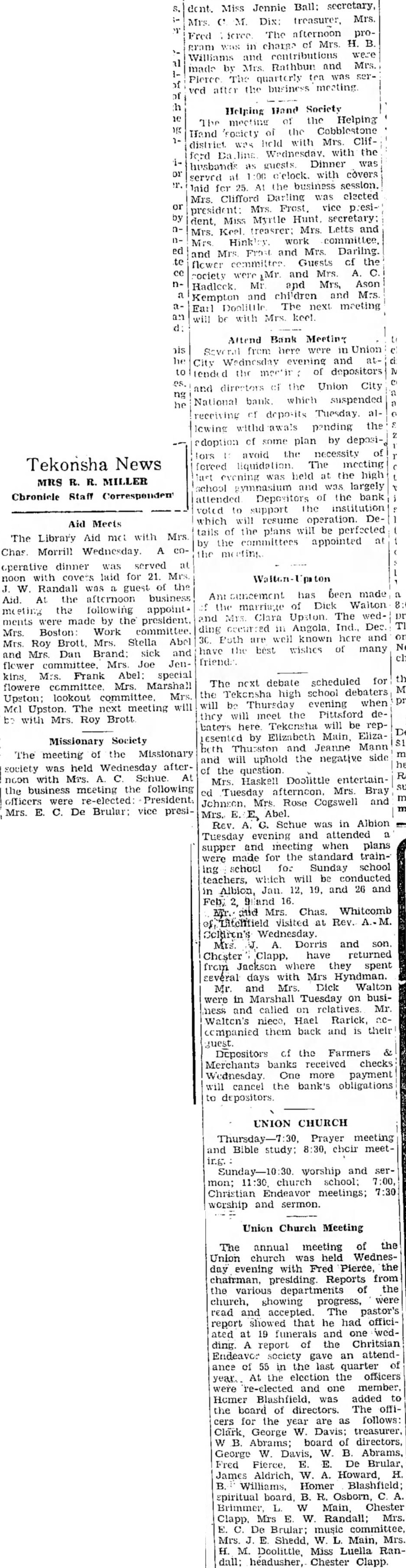Tekonsha News MRS R. R. MILLER Chronicle Staff Correspondent Aid Meets The Library Aid met with Mrs. operative dinner was served at noon with covers laid for 21. Mrs J. W. Randall was a guest of the Aid. At the afternoon business me eting the following appointments were made by the president. Mrs. Boston Work committee. Mrs. Roy Brott. Mrs. Stella Abel and Mrs. Dan Brand: sick and flower committee. Mrs. Joe Jenkins, Mrs. Frank Abel: special flowere committee Mrs. Marshall Upston: lookout committee. Mrs. Mcl Upston The next meeting will be with Mrs. Roy Brott Missionary Society The meeting of the Misstonary society was held Wednesday afternoon with Mrs. A. C. Schue At the business meeting the following officers were re-elected: President Mrs. E. C. De Brular: vice presi- dont. Miss Jennie Ball: secretary, Mrs. C' M. Dix: treasurer, Mrs. Fred icree The afternoon program was in charge of Mrs. H. B. Williams and contributions were made by Mrs. Rathbun and Mrs. Pierce The quarterly ten was served after the business meeting Helping Hand Society The meeting of the Helping Hand society of the Cobblestone district was held with Mrs. Clifford Da line Wednesday. with the husbands as guests Dinner was served at 1:00 c'elock. with covers laid for 25. A1 the business session. Mrs. Clifford Darling was elected preside Mrs. Frost vice p:esident, Miss Myrtle Hunt secretary: Mrs. Keel treasrer: Mrs. Letts and and Mrs. Frost and Mrs. Dariing. flower committee Guests of the rociety were Mr. and Mrs. A. C. Hadlcck. Mr and Mrs, Ason Kempton and children and Mrs. Earl Doolitile The next meeting will be with Mrs. keel. Attend Bank Meeting Seve ral from here were in Union City Wednesday evening and attender the meetin of depositors and directors of the Union City National bank which suspended receiving of deposits Tuesday allewing withd awals pending the edoption of some plan by deposilors avoid the necessity of forced liquidation The meeting last evening was held at the high school gymnasium and was largely attended Depositors of the bank voted to support the institution which will resume operation. Details of the plans will be perfected by the committees appointed at the eting Ant suncement has been made :f the marriage of Dick Walton and Mrs. Clara Upston. The wedding occurred in Angola. Ind., Dec. 3C. Poth are well known here and have the best wishes of many The next debate scheduled for the Tekonsha high school debaters will be Thursday evening when they will meet the Pittsford debaters here Tekonsha will be repesented by Elizabeth Main, Elizaboth Thuston and Jeanne Mann and will uphold the negative side of the Mrs. Haskell Doolittle entertained Tuesday afternoon. Mrs. Bray Johnson, Mrs. Rose Cogswell and Mrs. E. E, Abel. Rev. A. G. Schue was in Albion Tuesday evening and attended a supper and meeting when plans were made for the standard training school for Sunday school teachers, which will be conducted in Albion, Jan. 12, 19, and 26 and Feb, 2, 98and 16. Mr. and Mrs. Chas. Whitcomb of, Litchfield Visited at Rev. M. Mrs. J. A Dorris and son Choster Clapp, have returned from Jackson where they spent several days with Mrs Hyndman. Mr. and Mrs. Dick Walton were in Marshall Tuesday on business and called on relatives Mr. Walten's nieco, Hael Rarick, nccompanied them back and is their guest Depositors of the Farmers & Merchants banks received checks Wednesday One more payment will cancel the bank's obligations to depositors. UNION CHURCH Thursday-7:30, Prayer meeting and Bible study: 8:30, chcir meetir.g. Sunday-10:30. worship and sermon; 11:30 church school: 7:00, Christian Endeavor meetings; 7:30 worship and sermon. Union Church Meeting The annual meeting of the Union church was held Wednesday evening with Fred Pierce, the chairman, presiding. Reports from the various departments of the church, showing progress, were read and accepted. The pastor's report showed that he had officiated at 19 funerals and one wedding. A report of the Chritsian Endeavor society gave an attendance of 55 in the last quarter of year. At the election the officers were re-elected and one member. Hcmer Blashfield, was added to the board of directors. The officers for the year are as follows: Clark, George W. Davis; treasurer, W B. Abrams; board of directors, George W. Davis, W. B. Abrams, Fred Fierce, E. E. De Brular, James Aldrich, W. A. Howard H. B. Williams, Homer Blashfield; spiritual board, B. R. Osborn, C A. Brimmer, L. W Main, Chester Clapp. Mrs E. W. Randall; Mrs. E. C. De Brular; music committee, Mrs. J. E. Shedd, W. L. Main, Mrs. H. M. Doolittle, Miss Luella Randall: headusher, Chester Clapp.