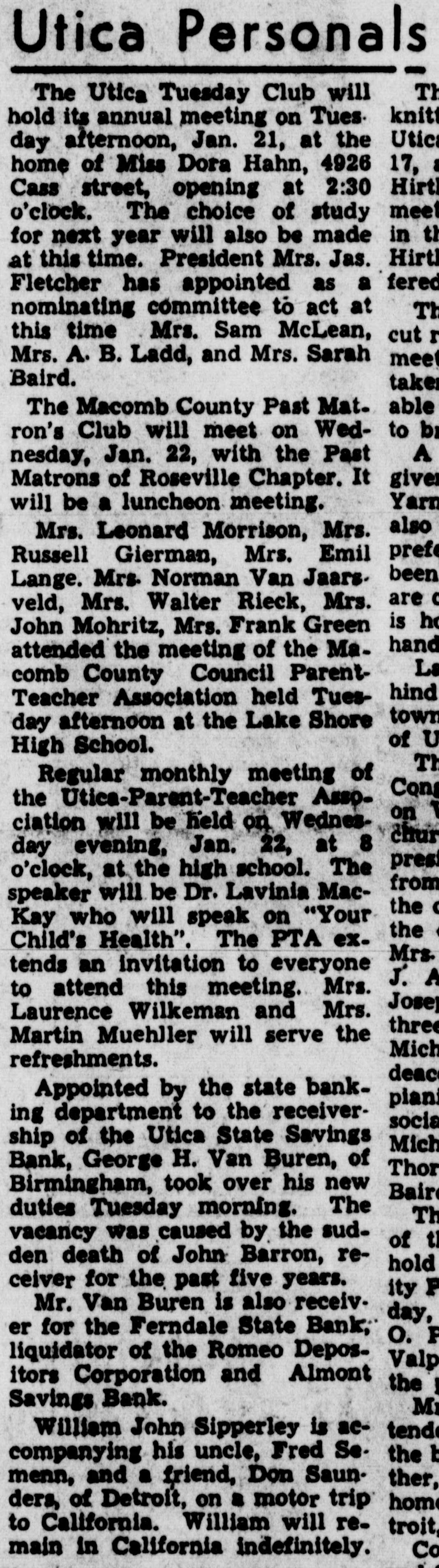 Utica Personals TH The Utica Tuesday Club will hold its annual meeting on Tues. knit Utic day afternoon, Jan. 21, at the home of Miss Dora Hahn, 4926 17, 8 Cass street, opening at 2:30 Hirt o'clock. The choice of study meet for next year will also be made in tl at this time. President Mrs. Jas. Hirtl Fletcher has appointed as a fered nominating committee to act at Th this time Mrs. Sam McLean, cut I Mrs. A. B. Ladd, and Mrs. Sarah meet Baird. take able The Macomb County Past Matron's Club will meet on Wed- to by A nesday, Jan. 22, with the Past Matrons of Roseville Chapter. It give Yarn will be a luncheon meeting. also Mrs. Leonard Morrison, Mrs. prefe Russell Gierman, Mrs. Emil been Lange. Mrs. Norman Van Jaars. are o veld, Mrs. Walter Rieck, Mrs. is he John Mohritz, Mrs. Frank Green hand attended the meeting of the MaLa comb County Council Parenthind Teacher Association held Tuestowr day afternoon at the Lake Shore of U High School. The Regular monthly meeting of Con the Utica-Parent-Teacher Assoon 1 ciation will be held on Wedneschur day evening, Jan. 22, at 8 pres o'clock, at the high school. The from speaker will be Dr. Lavinia Macthe ( Kay who will speak on "Your the Child's Health". The PTA exMrs. tends an invitation to everyone J. A to attend this meeting. Mrs. Jose Laurence Wilkeman and Mrs. three Martin Muehller will serve the Mich refreshments. deac Appointed by the state bankpiani ing department to the receiversocia ship of the Utica State Savings Mich Bank, George H. Van Buren, of Thor Birmingham, took over his new Bair duties Tuesday morning. The The vacancy was caused by the sudof t den death of John Barron, rehold ceiver for the past five years. ity P Mr. Van Buren is also receivday, er for the Ferndale State Bank; O. F liquidator of the Romeo DeposValp itors Corporation and Almont the I Savings Bank. M William John Sipperley is actend the 1 companying his uncle, Fred Semenn, and a friend, Don Saunther, ders, of Detroit, on a motor trip home