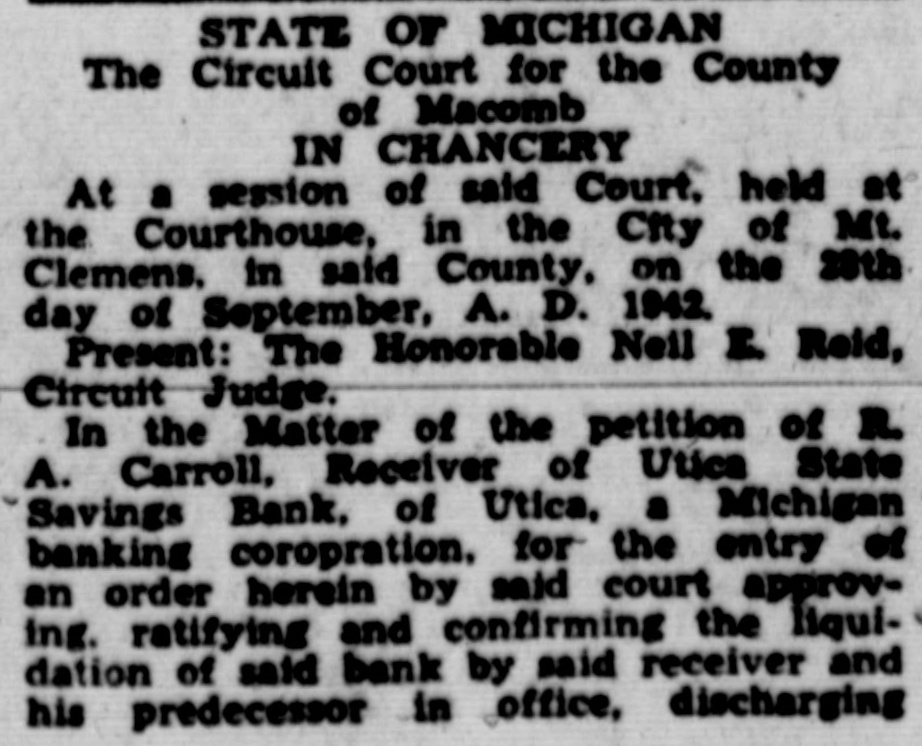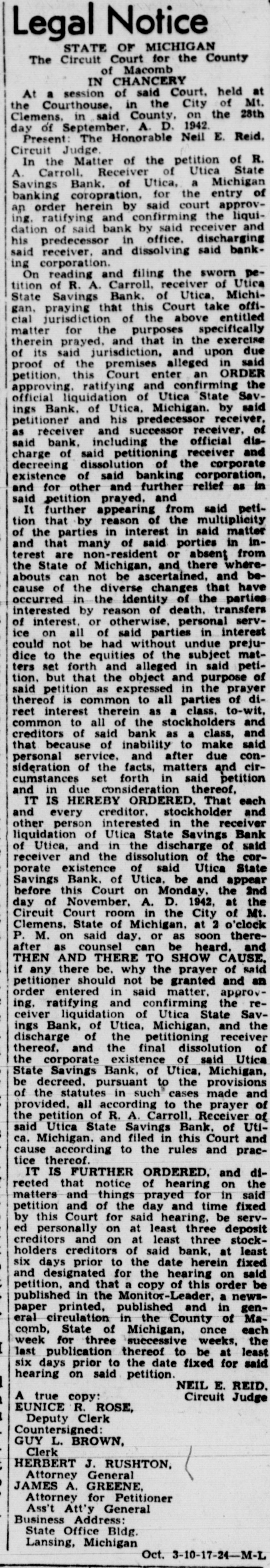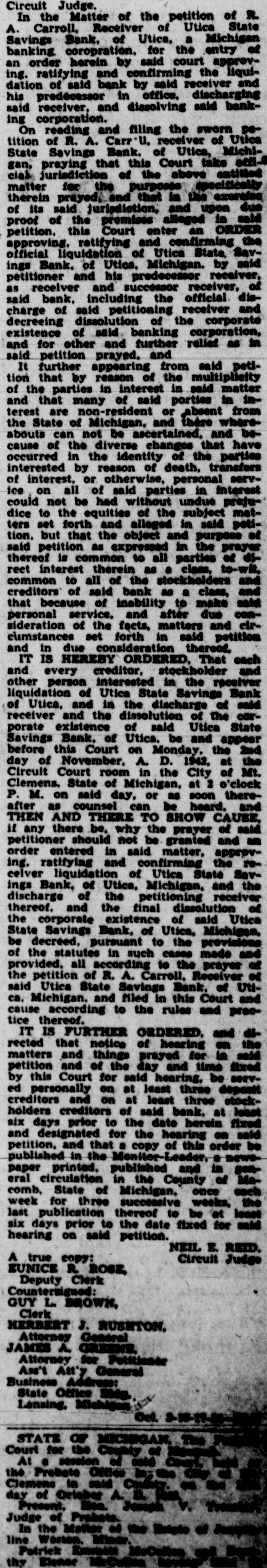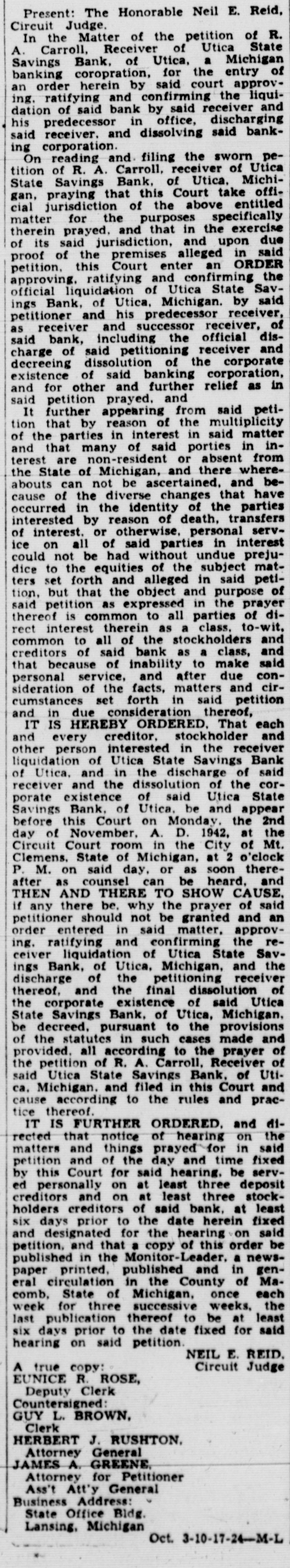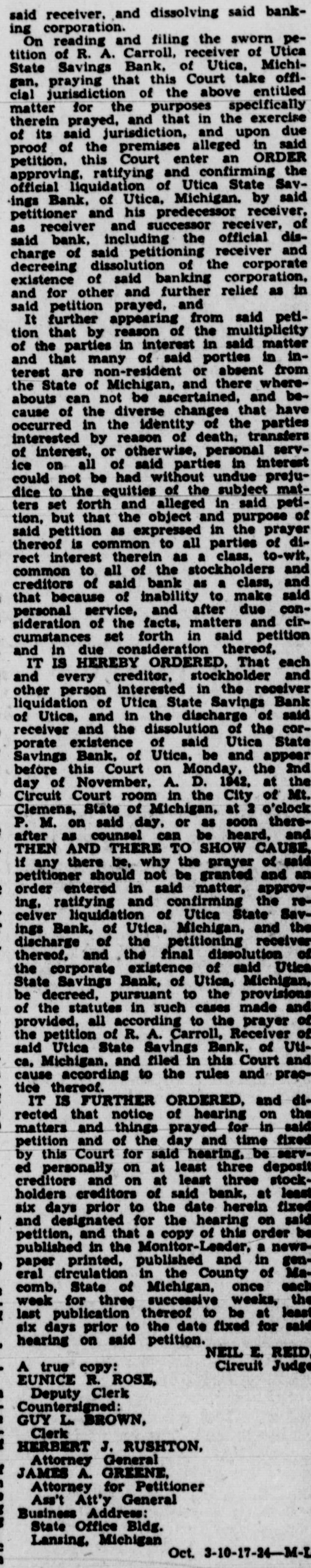 day of September, A. D. 1942. Present: The Honorable Neil E. Reid. Circuit Judge. In the Matter of the petition of R. A. Carroll, Receiver of Utica State Savings Bank. of Utica, a Michigan banking coropration. for the entry of an order herein by said court approving. ratifying and confirming the liquidation of said bank by said receiver and his predecessor in office. discharging said receiver, and dissolving said banking corporation. On reading and filing the sworn petition of R. A. Carroll, receiver of Utica State Savings Bank. of Utica. Michigan, praying that this Court take official jurisdiction of the above entitled matter for the purposes specifically therein prayed, and that in the exercise of its said jurisdiction, and upon due proof of the premises alleged in said petition, this Court enter an ORDER approving, ratifying and confirming the official liquidation of Utica State Savings Bank. of Utica, Michigan. by said petitioner and his predecessor receiver. as receiver and successor receiver, of said bank, including the official discharge of said petitioning receiver and decreeing dissolution of the corporate existence of said banking corporation. and for other and further relief as in said petition prayed. and It further appearing from said petition that by reason of the multiplicity of the parties in interest in said matter and that many of said porties in interest are non-resident or absent from the State of Michigan, and there whereabouts can not be ascertained, and because of the diverse changes that have occurred in the Identity of the parties interested by reason of death. transfers of interest. or otherwise, personal service on all of said parties in interest could not be had without undue prejudice to the equities of the subject matters set forth and alleged in said petition. but that the object and purpose of said petition as expressed in the prayer thereof is common to all parties of direet interest therein as a class. to-wit. common to all of the stockholders and creditors of said bank as a class, and that because of inability to make said personal service, and after due consideration of the facts, matters and circumstances set forth in said petition and in due consideration thereof, IT IS HEREBY ORDERED. That each and every creditor. stockholder and other person interested in the receiver liquidation of Utica State Savings Bank of Utica, and in the discharge of said receiver and the dissolution of the corporate existence of said Utica State Savings Bank. of Utica, be and appear before this Court on Monday, the 2nd day of November, A. D. 1942, at the Circuit Court room in the City of Mt. Clemens. State of Michigan, at 2 o'clock P. M. on said day, or as soon thereafter as counsel can be heard. and THEN AND THERE TO SHOW CAUSE. if any there be. why the prayer of said petitioner should not be granted and an order entered in said matter. approving, ratifying and confirming the receiver liquidation of Utica State Savings Bank, of Utica, Michigan, and the discharge of the petitioning receiver thereof, and the final dissolution of the corporate existence of said Utica State Savings Bank, of Utica, Michigan, be decreed. pursuant to the provisions of the statutes in such cases made and provided, all according to the prayer of the petition of R. A. Carroll, Receiver of said Utica State Savings Bank. of Utica. Michigan. and filed in this Court and cause according to the rules and practice thereof. IT IS FURTHER ORDERED. and directed that notice of hearing on the matters and things prayed for in said petition and of the day and time fixed by this Court for said hearing, be served personally on at least three deposit creditors and on at least three stockholders creditors of said bank, at least six days prior to the date herein fixed and designated for the hearing on said petition, and that a copy of this order be published in the Monitor-Leader, a newspaper printed, published and in general circulation in the County of Macomb, State of Michigan, once each week for three successive weeks, the last publication thereof to be at least six days prior to the date fixed for said hearing on said petition. NEIL E. REID. A true copy: Circuit Judge EUNICE R. ROSE, Deputy Clerk Countersigned: GUY L. BROWN, Clerk HERBERT J. RUSHTON, Attorney General JAMES A. GREENE, Attorney for Petitioner Ass't Att'y General Business Address: State Office Bldg. Lansing, Michigan Oct. 3-10-17-24-M-L