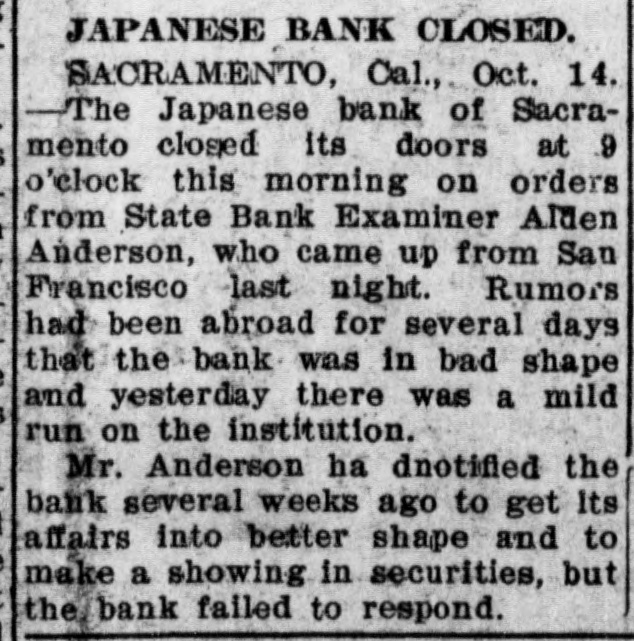 JAPANESE BANK CLOSED. SACRAMENTO, Cal., Oct. 14. The Japanese bank of Sacramento closed its doors at 9 o'clock this morning on orders from State Bank Examiner Alden Anderson, who came up from San Francisco last night. Rumors had been abroad for several days that the bank was in bad shape and yesterday there was a mild run on the institution. Mr. Anderson ha dnotified the bank several weeks ago to get Its affairs into better shape and to make a showing in securities, but the bank failed to respond.