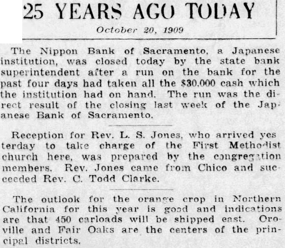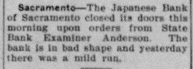 Sacramento-The Japanese Bank of Sacramento closed Its doors this morning upon orders from State Bank Examiner Anderson. The bank is in bad shape and yesterday there was a mild run.
