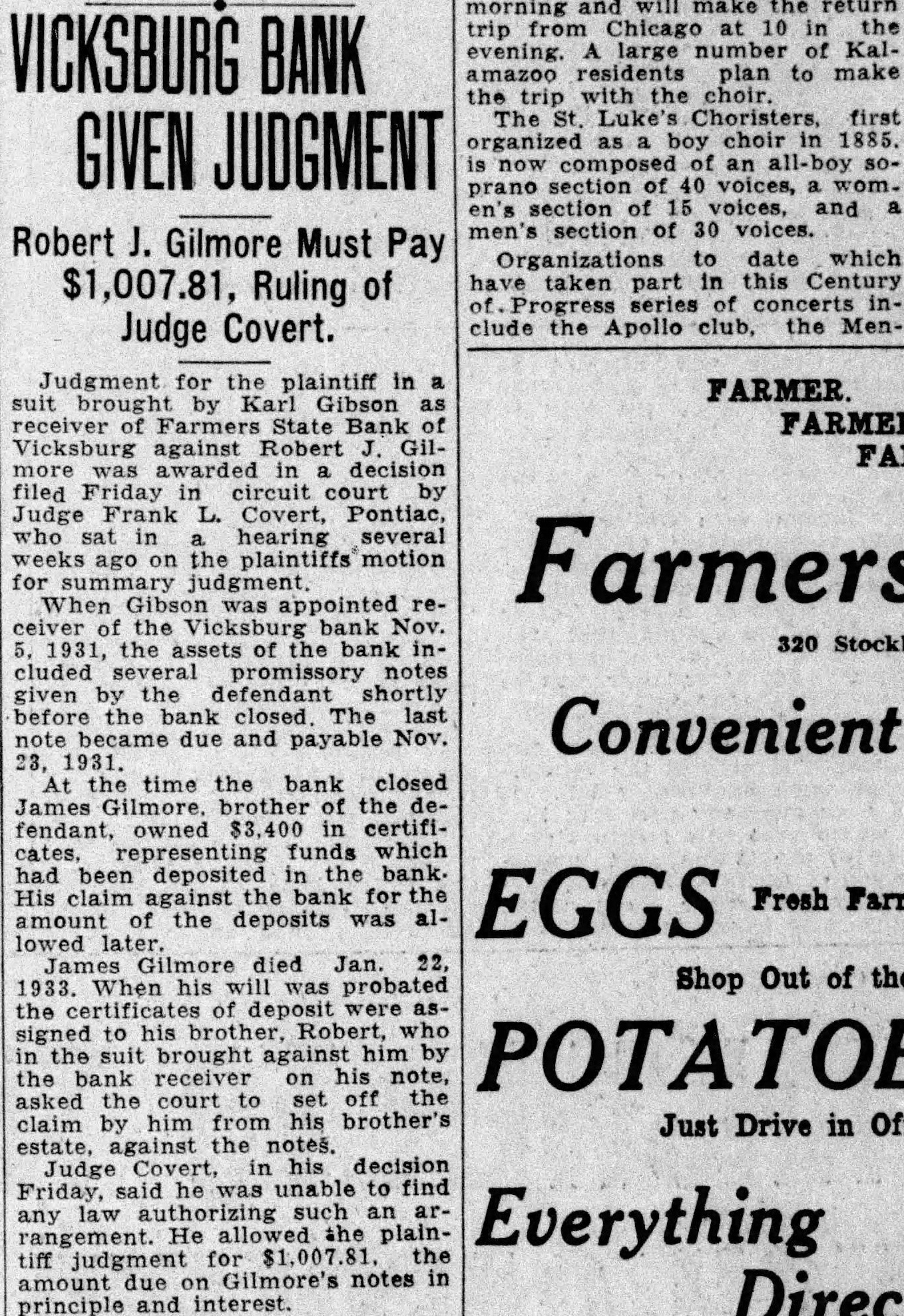 VICKSBURG BANK GIVEN JUDGMENT Robert J. Gilmore Must Pay $1,007.81, Ruling of Judge Covert. Judgment for the plaintiff in FARMER suit brought by Kar Gibson as receiver of Farmers State Bank FARMER Vicksburg against Robert Gil. awarded in decision filed Friday in circuit court by Judge Frank L. Covert, Pontiac. who sat in hearing several weeks ago on the plaintiffs motion for summary judgment When Gibson was appointed reof the Vicksburg bank Nov. the of the bank included promissory notes given by the defendant shortly before the bank closed The last Convenient note became due and payable Nov. 1931. At the time the bank closed James Gilmore. brother the defendant, owned in certificates, representing funds which had been deposited in the bank. His claim against the for the EGGS amount of the deposits was allowed later Gilmore died Jan. 22. 1933. When his will was probated the certificates of deposit were assigned to his brother, Robert, who in suit brought against him by POTATOES the receiver on his note, asked bank the court to set off the claim by him from his brother's estate, against the notes. Judge Covert, in his decision Friday, said he was unable to find any law such an He the plaintiff judgment for $1,007.81 the due on Gilmore's notes in amount principle and interest.