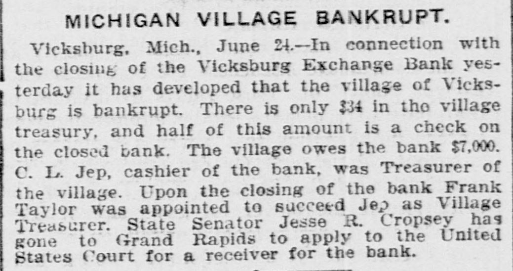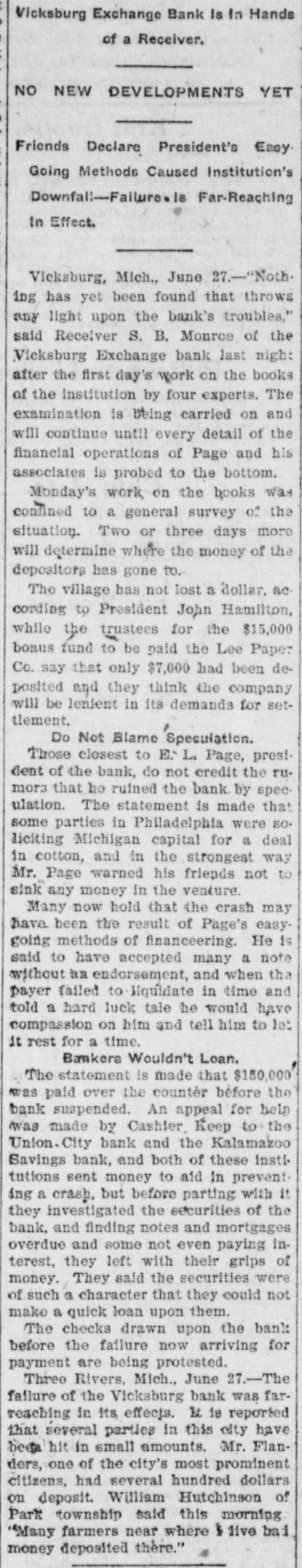 Business Failures Jan. 3-First national bank of Faribault, Minn., closed; receiver appointed. 9-Brott cotton mills, Massachusetts, capital $1,200,000. 23-Strauss-Green Co., Toledo, O.; liabilities $115,000. assets $100,000. 27-Standard Rope & Twine Co., N. Y., for $12,000,000. 29-Pan-American bank, Chicago; assets $17,200, liabilities $75,900. Mar. 5-Arnold Brewing Co. Saulte St. Marie, Mich.; liabilities $85,000; assets $65,000. 6-Spartansburg Pa. bank: capital, $25,000. 7-Coe Co., Minneapolis; liabilities, $200,000. 31-Citizens' bank, Lorain, O., as result of defalcation. Apr. 3-Ladoga, Ind., bank; assets $80,000. liabilities $109,000. 16-Owosso, Mich., private bank closes. 23-Merchants' Trust Co., New York, closed. 24-Canton, O., state bank closes Lexington, Okla., First national bank fails. 26-Barberton O., First national bank 27-R. H. York & Co., old Cleveland, O., brokers; liabilities, $40,000. Jun. 2-Ladysmith, Wis., First national bank closed. 19-Fyfe & Munson, Chicago, placed in recelver's hands. 21-City Trust Co., Philadelphia, closes doors. 23-Vicksburg, Mich. exchange bank. 26-Knight, Donnelly & Co., Chicago, 28-Terre Haute, Ind., national bank closed doors. Jul. 5-Spring Valley, III., and Toluca, III., national banks close. 6-Hagerstown. Ind., Commercial bank; liabilities, $125,000. 13-Citizens bank, Yellow Springs, O.: liabilities, $50,000. 19-Spring Valley, O., bank closes. 20-City national bank. Kansas City, Mo. Aug. 3-West Liberty, Ky., bank closes. 10-Four Denver, Col., Western bank officials arrested on fraud charge. 21-Western bank, Louisville, Ky.; due to overloans. Sep. 19-Minot. S. D., national bank closes doors. 27-Johnson & Sloan, Minneapolis, Minn.: liabilities, $200,000 First national bank, Orville, O., closes doors. Oct. 6-Peoria (III.) national bank closes because of Dougherty indictments. Nov. 1-Kingfisher (Okla.) national bank closed by comptroller of currency Dec. 18-John R. Walsh's three banks in Chicago. Chicago National, Home SavIngs and Equitable company in liquidation. Local clearing house guarantees payment of $26,000,000. Public and private accounts involved. 27-Merchants Trust company, American Savings bank and Mechanics Savings bank, Memphis, Tenn. close doors; first named in liquidation.