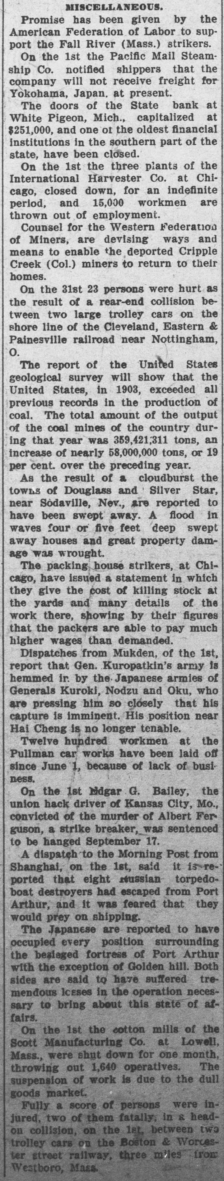 MISCELLANEOUS. Promise has been given by the American Federation of Labor to support the Fall River (Mass.) strikers. On the 1st the Pacific Mail Steamship Co. notified shippers that the company will not receive freight for Yokohama, Japan. at present. The doors of the State bank at White Pigeon, Mich., capitalized at $251,000, and one of the oldest financial institutions in the southern part of the state, have been closed. On the 1st the three plants of the International Harvester Co. at Chicago, closed down, for an indefinite period, and 15,000 workmen are thrown out of employment. Counsel for the Western Federation of Miners, are devising ways and means to enable the deported Cripple Creek (Col.) miners to return to their homes. On the 31st 23 persons were hurt as the result of a rear-end collision between two large trolley cars on the shore line of the Cleveland, Eastern & Painesville railroad near Nottingham, O. The report of the United States geological survey will show that the United States, in 1903, exceeded all previous records in the production of coal. The total amount of the output of the coal mines of the country during that year was 359,421,311 tons, an increase of nearly 58,000,000 tons, or 19 per cent. over the preceding year. As the result of a cloudburst the towns of Douglass and Silver Star, near Sódaville, Nev., are reported to have been swept away. A flood in waves four or five feet deep swept away houses and great property damage was wrought. The packing house strikers, at Chicago, have issued a statement in which they give the cost of killing stock at the yards and many details of the work there, showing by their figures that the packers are able to pay much higher wages than demanded. Dispatches from Mukden, of the 1st, report that Gen. Kuropatkin's army is hemmed ir. by the Japanese armies of Generals Kuroki, Nodzu and Oku, who are pressing him so closely that his capture is imminent. His position near Hai Cheng is no longer tenable. Twelve hundred workmen at the Pullman car works have been laid off since June 1, because of lack of business. On the 1st Edgar G. Bailey, the union hack driver of Kansas City, Mo., convicted of the murder of Albert Ferguson, a strike breaker, was sentenced to be hanged September 17. A dispatch to the Morning Post from Shanghai, on the 1st, said it is-reported that eight reussian torpedoboat destroyers had escaped from Port Arthur, and it was feared that they would prey on shipping. The Japanese are reported to have occupied every position surrounding the besieged fortress of Port Arthur with the exception of Golden hill. Both sides are said to have suffered tremendous lceses in the operation necessary to bring about this state of affairs. On the 1st the cotton mills of the Scott Manufacturing Co. at Lowell, Mass., were shut down for one month, throwing out 1,640 operatives. The suspension of work is due to the dull goods market. Fully a score of persons were injured, two of them fatally, in & headon collision, on the 1st, between two trolley cars on the Boston & Worcester street railway, three miles from Westboro, Mass.