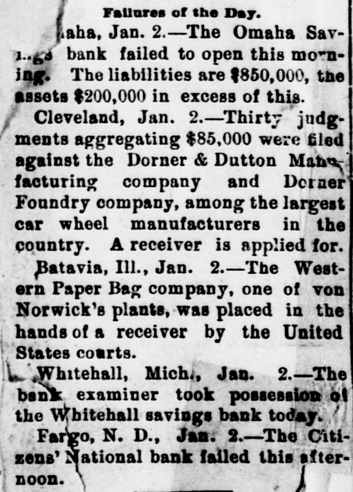 Failures of the Day. aha, Jan. 2.-The Omaha Sav1.60 bank failed to open this morning. The liabilities are $850,000, the assets $200,000 in excess of this. Cleveland, Jan. -Thirty judgments aggregating $85,000 were filed against the Dorner & Dutton Man facturing company and Derner Foundry company, among the largest car wheel manufacturers in the country. A receiver is applied for. Batavia, Ill., Jan. 2.-The Western Paper Bag company, one of von Norwick's plants, was placed in the hands of a receiver by the United States courts. Whitehall, Mich., Jan. 2. -The bank examiner took possession of the Whitehall savings bank today. Fargo, N. D., Jan. 2.-The Citizens' National bank failed this afternoon.