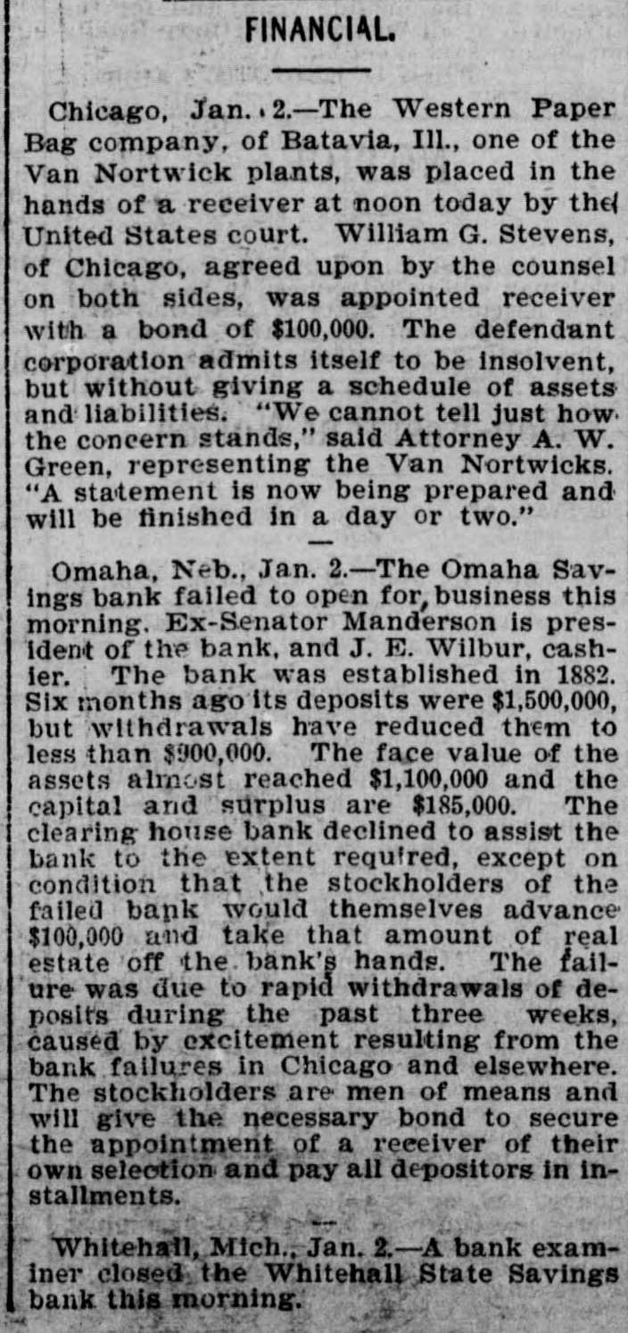 FINANCIAL. Chicago, Jan. . 2.-The Western Paper Bag company, of Batavia, Ill., one of the Van Nortwick plants, was placed in the hands of a receiver at noon today by the United States court. William G. Stevens, of Chicago, agreed upon by the counsel on both sides, was appointed receiver with a bond of $100,000. The defendant corporation admits itself to be insolvent, but without giving a schedule of assets and liabilities. "We cannot tell just how. the concern stands," said Attorney A. W. Green, representing the Van Nortwicks. "A statement is now being prepared and will be finished in a day or two." Omaha, Neb., Jan. 2. - -The Omaha Savings bank failed to open for, business this morning. Ex-Senator Manderson is president of the bank, and J. E. Wilbur, cashier. The bank was established in 1882. Six months ago its deposits were $1,500,000, but withdrawals have reduced them to less than $900,000. The face value of the assets almost reached $1,100,000 and the capital and surplus are $185,000. The clearing house bank declined to assist the bank to the extent required, except on condition that the stockholders of the failed bank would themselves advance $100,000 and take that amount of real estate off the bank's hands. The failure was due to rapid withdrawals of deposits during the past three weeks, caused by excitement resulting from the bank failures in Chicago and elsewhere. The stockholders are men of means and will give the necessary bond to secure the appointment of a receiver of their own selection and pay all depositors in installments. Whitehall, Mich., Jan. 2.-A bank examiner closed the Whitehall State Savings bank this morning.