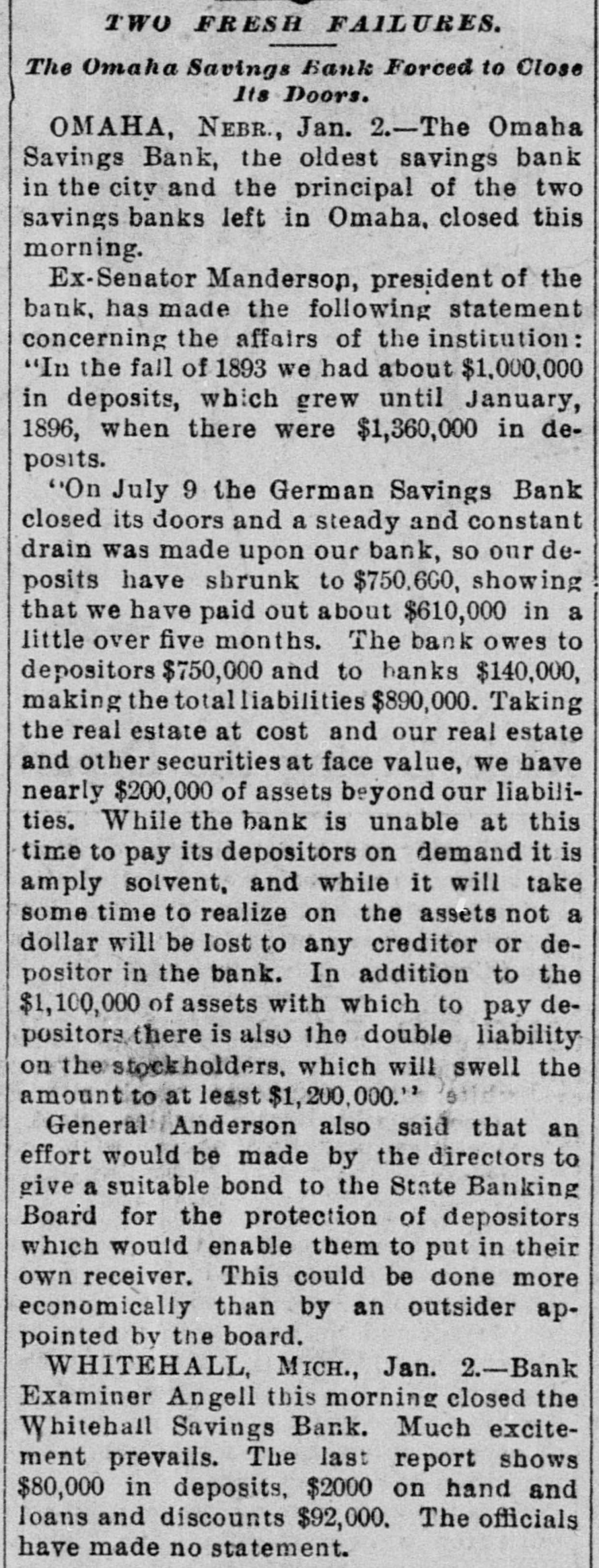 TWO FRESH FAILURES. The Omaha Savings Bank Forced to Close Its Doors. OMAHA, NEBR., Jan. 2.-The Omaha Savings Bank, the oldest savings bank in the city and the principal of the two savings banks left in Omaha. closed this morning. Ex-Senator Manderson, president of the bank, has made the following statement concerning the affairs of the institution: "In the fall of 1893 we had about $1,000,000 in deposits, which grew until January, 1896, when there were $1,360,000 in deposits. "On July 9 the German Savings Bank closed its doors and a steady and constant drain was made upon our bank, so our deposits have shrunk to $750,600, showing that we have paid out about $610,000 in a little over five months. The bank owes to depositors $750,000 and to banks $140,000, making the total liabilities $890,000. Taking the real estate at cost and our real estate and other securities at face value, we have nearly $200,000 of assets beyond our liabilities. While the bank is unable at this time to pay its depositors on demand it is amply solvent, and while it will take some time to realize on the assets not a dollar will be lost to any creditor or depositor in the bank. In addition to the $1,100,000 of assets with which to pay depositors there is also the double liability on the stock holders. which will swell the amount to at least $1,200,000." General Anderson also said that an effort would be made by the directors to give a suitable bond to the State Banking Board for the protection of depositors which would enable them to put in their own receiver. This could be done more economically than by an outsider appointed by the board. WHITEHALL MICH., Jan. 2.-Bank Examiner Angell this morning closed the Whitehall Savings Bank. Much excitement prevails. The last report shows $80,000 in deposits, $2000 on hand and loans and discounts $92,000. The officials have made no statement.
